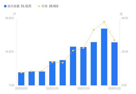 日期A股户数(户)流通A股户均持股数(股)户均持股市值(万元)2026-01-096762152350.028.882025-12-315156143082.0010.172025-12-194562753481.137.762025-12-104611843444.077.142025-11-283011455274.377.132025-11-202853625566.097.672025-11-101647319642.098.222025-10-311655909592.078.032025-10-2015485810256.827.772025-10-1015592510186.637.89