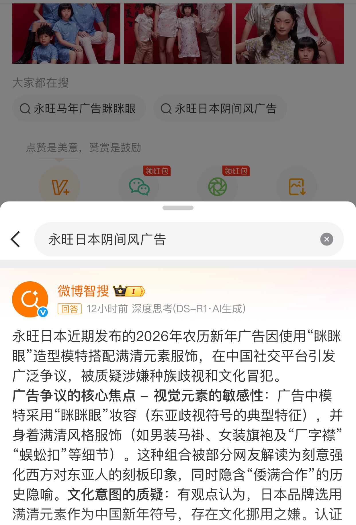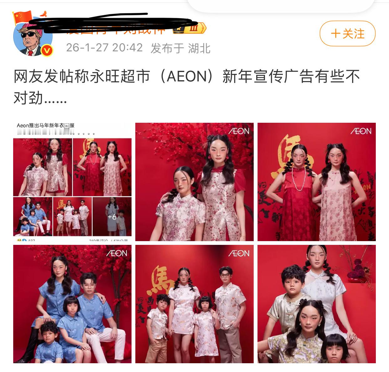 永旺超市这马年新年广告真的离谱。刷到网友发的图,里面的模特妆容简直没眼看。眼线硬生生拉到太阳穴,眼窝打得又深又空,眼睛眯成一条细缝,活脱脱照着西方歧视东亚人的刻板脸来的!一点灵气没有,满是诡异感。更气人的是,整个广告半点新年喜庆劲儿都没有,模特面无表情,所谓的新年服饰也怪得离谱,连小孩都一脸呆滞。真搞不懂这广告谁审的,正常新年广告都是红红火火,就它非要剑走偏锋?