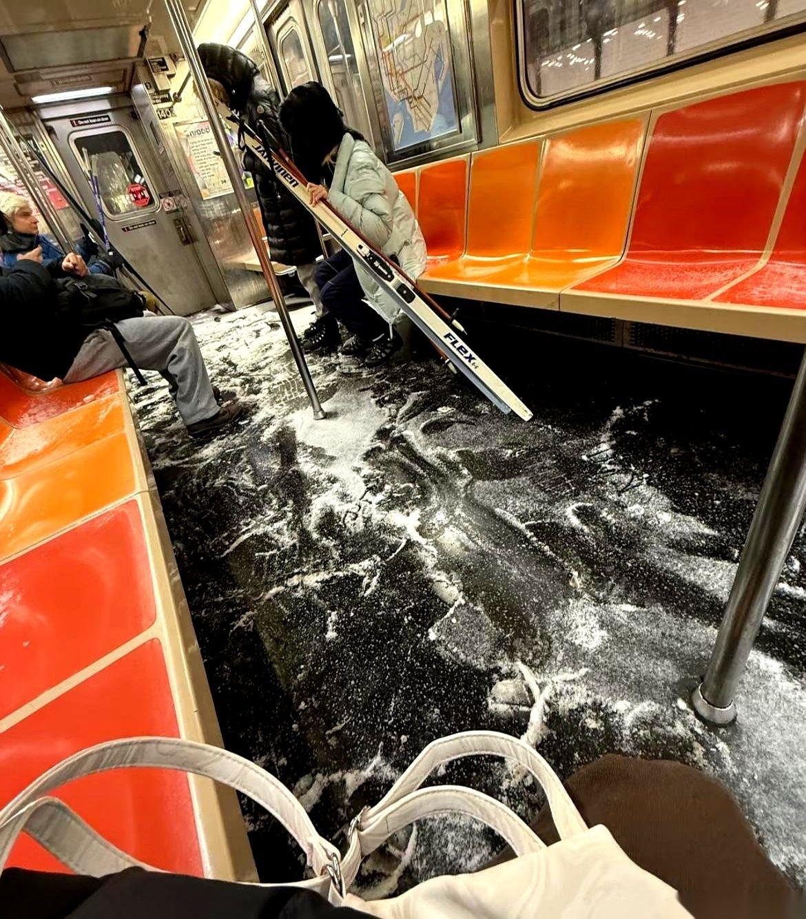 聽說紐約地鐵裡下雪了。 不是站台,是轟隆隆開著的車廂裡面,雪花從頂棚縫隙鑽進來,