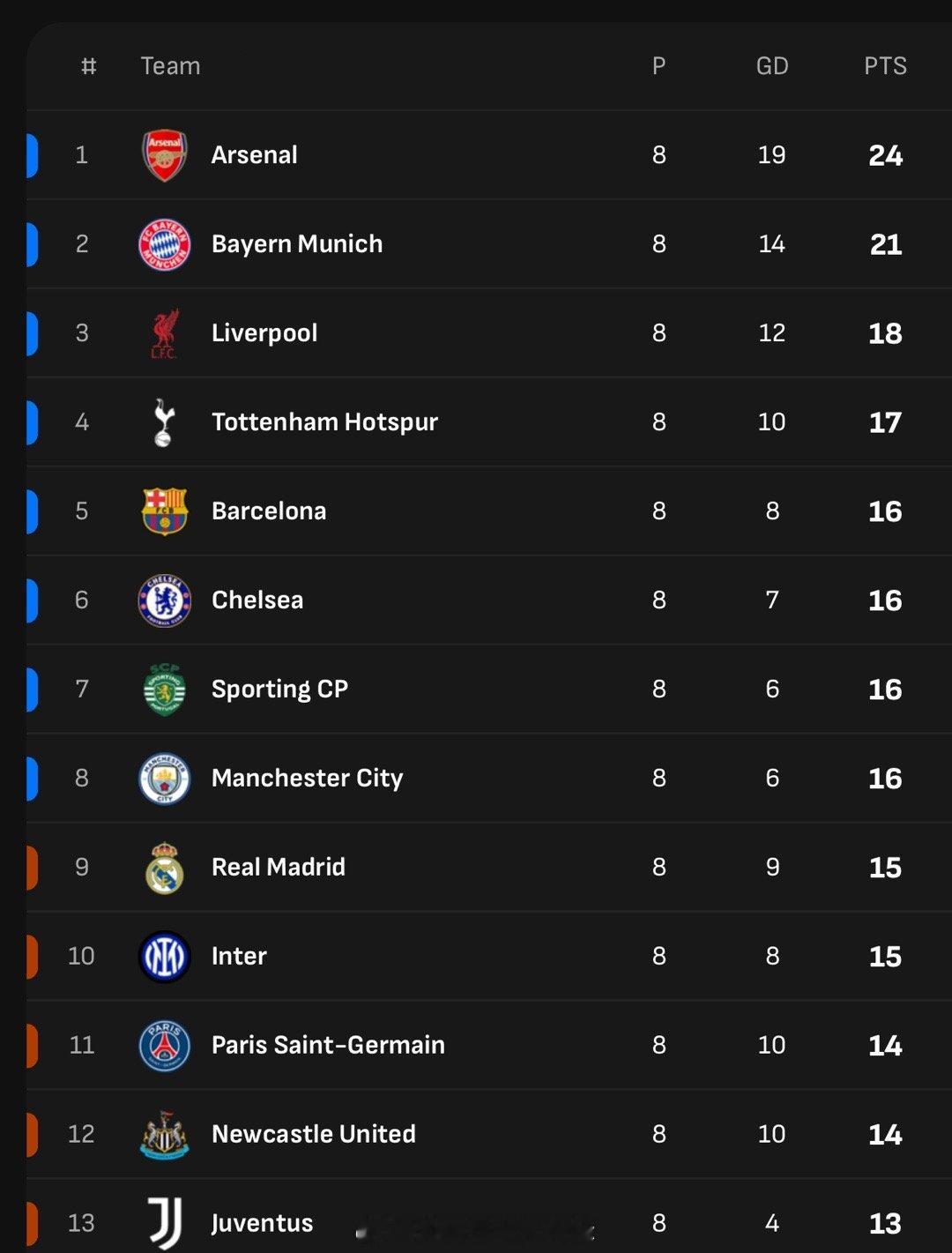 欧冠前八英超5队阿森纳欧冠8连胜6支参加本赛季欧冠的英超球队,有5支在首阶段最终排名前八,直接晋级16强淘汰赛:阿森纳、利物浦、热刺、切尔西、曼城。而纽卡斯尔则排名12位,要踢两回合的16强附加赛。