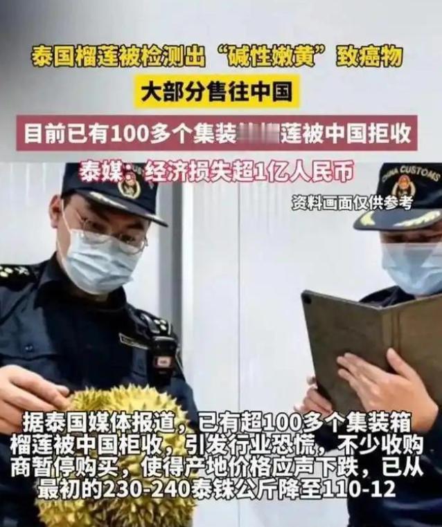 “赚中国人钱还毒害中国人?可谁能料到,泰国榴莲这事越挖越吓人,这泰国榴莲里竟藏着要命的东西,中国海关一纸检测报告捅破了天……” 中国人有多爱泰国榴莲?不用多说,逢年过节,不管是超市货架还是水果摊,金灿灿的榴莲总能被抢空。金枕头、猫山王,只要贴上 “泰国进口” 的标签,哪怕价格翻几倍,大家也心甘情愿掏钱。走亲访友带一盒,家里聚餐摆一盘,仿佛少了它,就少了几分年味和排面。 可我们没想到,就是这种被我们捧在手心、花大价钱买来的 “宝贝水果”,竟然藏着能要人命的工业致癌染料!不是个别现象,不是偶然失误,而是有人故意为之,专门盯着中国人的钱包,也盯着中国人的命. 中国海关从来不含糊,守护国人餐桌安全,就在最近,一份实打实的检测报告,直接把泰国榴莲的遮羞布撕得粉碎 —多批进口泰国榴莲,被检出含有超标几十倍的碱性嫩黄! 可能有人不知道这东西是什么,说白了,它就是一种工业染料,专门用来染棉花、染纸张的,毒性大到吓人,被世界卫生组织明确列为致癌物质,长期吃,会把肝肾慢慢拖垮,严重的还会诱发癌症,连小孩和老人都躲不过! 更让人火冒三丈的是,这种致命染料,根本不是不小心沾上去的,而是泰国商贩故意抹上去的。 自然成熟的榴莲,要等上大半年,还容易烂,损耗高,赚的钱少。可未成熟的青榴莲,只要用碱性嫩黄泡一泡、抹一抹,立马变得金灿灿、油亮亮,看起来就像熟透了的好果子,能直接以次充好,卖出高价。 这些商贩心里比谁都清楚,这东西有毒,不能用在食物上。可他们偏偏不管不顾,一边赚着中国人的血汗钱,一边反手就给我们喂毒药!合着我们把他们当朋友,花钱支持他们的产业,他们却把我们当傻子,拿我们的健康当赌注? 而且这事越挖越吓人,根本不是个别黑心商贩的所作所为,而是泰国榴莲产业的 “潜规则”!甚至连一些当地的大型批发商、种植园,都在这么干。 为啥没人管?因为泰国榴莲,全靠中国市场续命。这些年,中国成了泰国榴莲最大的买家,每年进口的榴莲,占了泰国出口总量的八成以上,每年给他们带去几百亿的收入。可以说,没有中国消费者,就没有泰国榴莲的今天,很多泰国商贩,就是靠赚中国人的钱发家致富、买房买车的。 泰国政府不是不知道这事,早就有人曝光过榴莲染色的问题,可他们装聋作哑、视而不见,为啥,因为榴莲是他们的经济支柱,他们怕严查之后,中国不再进口他们的榴莲,怕断了自己的财路。 还有更让人揪心的,这种致癌染料,很多竟然是从中国运过去的,一些黑心的中国供货商,为了赚差价,把这种禁止用于食品的工业染料,偷偷卖给泰国商贩,再经由泰国榴莲,重新卖回中国,坑害自己的同胞。 一边是中国资本远赴泰国,投资建厂、承包果园,帮他们发展榴莲产业;一边是泰国商贩和中国黑心供货商勾结,用致癌染料毒害中国消费者。这一圈下来,受伤的只有我们这些花钱买罪受的普通人。 可能有人会说,我买的榴莲看起来好好的,应该没事吧?别傻了!这种碱性嫩黄,无色无味,抹在榴莲皮上,根本看不出来、闻不出来,哪怕你削皮吃果肉,也难免会有残留,长期摄入,只会慢慢侵蚀你的身体。 自从海关检测出问题之后,已经依法拒收、销毁了上百柜的问题榴莲,价值超过 1 个亿,可即便如此,还是有一些泰国商贩不死心,想方设法蒙混过关,偷偷把染了毒的榴莲运进中国市场。 我们中国人,从来都不是好欺负的,我们愿意为优质的美味买单,愿意支持异国的特色产业,但我们绝对不会容忍,有人赚着我们的钱,还反过来毒害我们的健康。 中国海关已经明确表态,会加大对泰国榴莲的检测力度,每一批都要严查,绝不允许任何一批问题榴莲,流入中国市场、端上中国人的餐桌。 泰国榴莲能有今天的名气和销量,全靠中国消费者的偏爱和支持。别等到我们彻底失望,彻底放弃你们的时候,才后悔莫及。