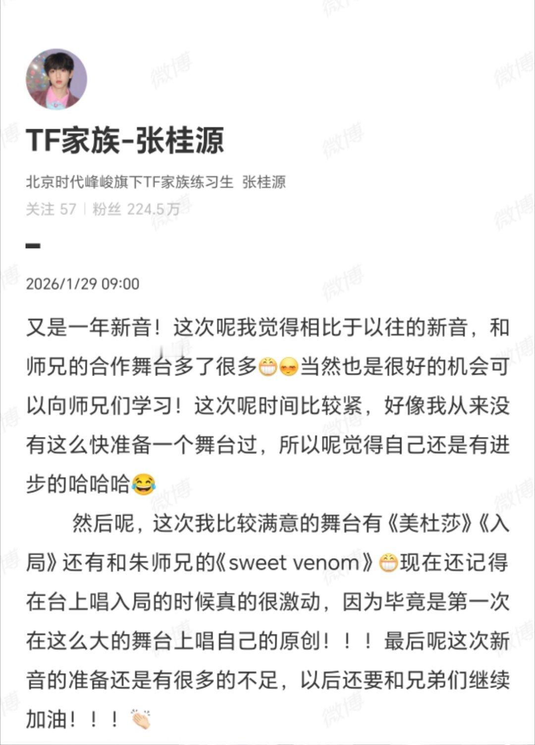 张桂源新音发文 说自己比较满意的舞台有《美杜莎》《入局》还有和朱志鑫的《sweet venom》 相信这次的荣耀之战舞台一定会更精彩~音福过大年奏响马年乐声