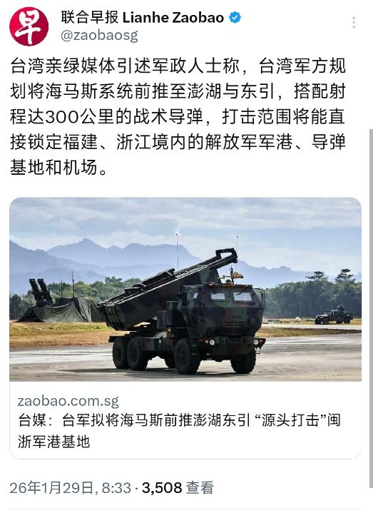 新加坡联合早报今天(1月29日)写道:“台湾亲绿媒体引述军政人士称,台湾军方规划将海马斯系统前推至澎湖与东引,搭配射程达300公里的战术导弹,打击范围将能直接锁定福建、浙江境内的解放军军港、导弹基地和机场。” 这俩地方是啥位置?那是咱们家门口的门户,离福建和浙江沿海那是相当的近。 他们这算盘打得噼里啪啦响,想着把海马斯这种机动性强的火箭炮部署过去,再配上射程三百公里的战术导弹。 那打击范围直指咱们福建、浙江境内的解放军军港、导弹基地还有机场,这显然是冲着咱们要害来的。 这种部署方案一出来,就足以证明岛内那帮人已经到了丧心病狂的地步,根本不想着怎么过日子,一门心思要给咱们添堵。 海马斯这玩意儿在俄乌战场上可是出了风头,被吹得神乎其神,好像是什么救命的稻草。 台湾当局显然也是迷信了这种西方的神话,觉得只要把这东西摆在澎湖和东引,就能捏住咱们的鼻子,在咱们头上悬一把剑。 他们以为这就能叫“不对称作战”,觉得咱们投鼠忌器,不敢轻易动手,就能以此作为他们搞分裂的筹码。 这种想法简直就是痴人说梦,完全低估了咱们捍卫国家主权和领土完整的决心。 咱们要清楚,澎湖列岛和东引岛,那离咱们大陆有多近?站在东引岛上,拿个望远镜都能看到咱们沿海的一举一动。 他们想把导弹架在咱们眼皮子底下,这不仅仅是挑衅,这是想把战火引到咱们家门口,逼着咱们必须得做点什么。 台湾军方规划这个动作,背后肯定少不了美国人的怂恿和指使,美国人就是想给岛内卖武器,想把这岛变成一个布满荆棘的刺猬,好给他们当代理人去送死。 可他们忘了,距离在现在的战争形态下,并不一定就是优势,反而可能成了送上门的靶子。 咱们现在的军力跟几十年前早就不可同日而语了,要是真想动手,根本不需要大军压境,光是在沿海布置的远程火力就足够覆盖这些岛屿。 他们把海马斯推到前线,看似是前伸了触角,实则是把自己的命根子暴露在了咱们的火力打击范围之内。 一旦真有什么风吹草动,这些所谓的“杀手锏”在第一波打击下就会灰飞烟灭,连响声都听不见。 那些岛内的分裂势力总想着“以武拒统”,总是觉得买几件美国武器就能跟大陆抗衡,这完全是自欺欺人。 他们以为这三百公里的射程是威胁,在咱们看来,这不过就是给咱们提供了精确打击的坐标。 咱们解放军的雷达和侦察设备早就把这周边的情况摸得透透的,他们的一举一动都在咱们的掌控之中。 只要他们敢把导弹竖起来,敢锁定咱们的军港和基地,那就是咱们动手的理由,那时候收复台湾可能就是一瞬间的事儿。 咱们一直强调和平统一,那是给两岸同胞留情面,不想看到骨肉相残。 但这不代表咱们对这种分裂行径会无限容忍,红线就在那儿,谁敢越雷池一步,谁就得承担后果。 台湾那些亲绿媒体还在那沾沾自喜,觉得这是个多么高明的战略规划,能震慑大陆。 殊不知这种动作恰恰是在把台湾往火坑里推,是在加速统一进程的催化剂。 美国人的海马斯在乌克兰是好用,那是因为乌克兰地形开阔,而且有北约的情报支持,能打完就跑。 台湾是个什么地形?是个狭长的海岛,澎湖和东引更是孤悬海上的小岛,往哪儿跑? 海马斯再怎么机动,也需要依托道路和掩体,在咱们饱和式打击下,他们根本没有生存空间。 这帮人为了政治私利,完全不顾台湾老百姓的死活,要把战火引到家门口,这种行为是极其自私和残忍的。 咱们福建和浙江的百姓看着对岸这阵势,虽然可能会觉得有些紧张,但更多的是对国家实力的自信。 咱们现在需要的不是跟他们打口水仗,而是扎扎实实地做好备战准备,让他们看看什么是真正的雷霆万钧之力。 新加坡联合早报这报道虽然客观陈述了台湾军方的规划,但字里行间也能看出外界对这种冒险行为的担忧。 这种把战火烧向大陆的企图,绝对是玩火自焚,历史上从来没有哪一个搞分裂的人能有好下场。 台湾当局要是真敢把这三百公里的导弹对准咱们,那就是撕破了脸皮,咱们也就没必要再跟他们客气。 到时候别说澎湖和东引,就是台湾本岛的那些指挥中心、导弹阵地,都得在一波打击下瘫痪。 这帮搞“台独”的人心里其实比谁都清楚,他们根本赢不了,所以才会像赌徒一样不断加注,试图通过挑衅来换取国际社会的关注。 咱们正好可以利用这个机会,演练一下怎么快速清除前沿威胁,怎么封锁海峡,怎么立体登陆。 台湾军方这一步棋,走臭了,彻底暴露了他们的战略意图和部署弱点,给咱们提供了更充分的理由去加强东南方向的军事部署。 咱们要把这一巴掌打回去,就得打疼,得让他们知道,惹翻了中国,他们没有好果子吃。 那些所谓的“军政人士”在媒体上大放厥词,觉得这是一种威慑,在咱们看来这不过是秋后的蚂蚱在蹦跶。 咱们有足够的实力、足够的意志、足够的手段,来捍卫国家的每一寸土地。