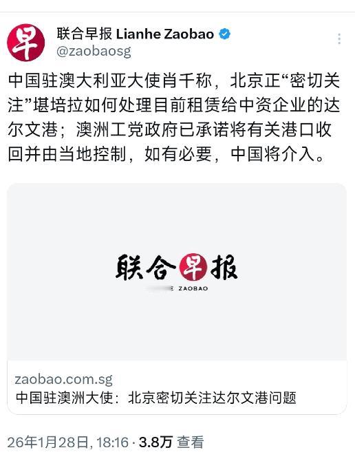 新加坡联合早报昨晚(1月28日晚)报道:“中国驻澳大利亚大使肖千称,北京正‘密切关注’堪培拉如何处理目前租赁给中资企业的达尔文港;澳洲工党政府已承诺将有关港口收回并由当地控制,如有必要,中国将介入。” 可能有人还不清楚来龙去脉,咱先把这事捋顺了。 达尔文港的租约可不是私下敲定的,早在2015年,中国岚桥集团就通过公开透明的竞标程序,拿到了这座港口99年的经营权,当时这笔交易还经过了澳大利亚外国投资审查委员会的批准,完全符合澳方的法律规定和市场规则,从头到尾都挑不出一点毛病。 这十多年来,岚桥集团在达尔文港身上砸了不少钱,一边维护和升级港口的基础设施,一边优化运营管理、拓展客户资源,硬生生把曾经亏损的港口做到了扭亏为盈,不光让港口本身焕发新生,还为当地的经济发展和就业带来了实实在在的好处。 可谁能想到,现在港口开始盈利了,澳大利亚工党政府却变了卦。 澳洲工党政府早就放话承诺,要把达尔文港从中国企业手里收回来,交由当地掌控,这番表态也不是随口说说,近期澳方相关部门已经在暗中推进这事,这才有了肖千大使昨晚被报道的那番回应。 肖千大使的表态,既有克制也有底线,他特意提到,岚桥集团的租约合法合规,这些年为达尔文港的发展付出了很多,这样的企业和项目本该得到鼓励,而不是被刻意针对。 他直言不讳,在港口亏损的时候,澳方把它租给外国企业,如今盈利了就想强行收回,这种做法在道义上根本站不住脚,也不符合国际经贸往来中最基本的契约精神。 而中方提到的“如有必要将介入”,也绝不是空喊口号,背后藏着的是维护中资企业合法权益的坚定决心。 要知道,中国政府本来就有义务保护海外中资企业的合法权益,达尔文港的租约是经过正规程序签订的长期协议,受法律保护,澳方要是真敢单方面撕毁协议、强行收回港口,那就是侵犯中资企业的合法权益,中方自然不会坐视不管。 就在肖千大使表态的差不多同一时间,中国外交部发言人郭嘉昆也在例行记者会上重申了中方立场。 郭嘉昆明确表示,中资企业是通过市场方式获得的达尔文港租约,其合法权益必须得到充分保护,两场表态前后呼应,也让外界看清了中方在这件事上的统一立场。 其实明眼人都能看出来,澳方执意要收回达尔文港,所谓的“安全顾虑”不过是借口,本质上还是政治操弄在作祟,甚至背后还有外部势力的推动。 达尔文港地处澳大利亚北部战略要冲,是面向亚洲的门户,也是美国“印太”军事布局的重要节点,这些年美国一直在暗中施压,想让澳方收回港口控制权,方便自己进一步推进军事部署。 岚桥集团这边也早就亮明了态度,作为港口当前的运营方,他们从来没有想过出售港口,也从来没有和澳政府就终止租约、改变合同安排有过任何接触,在他们眼里,这座港口就是“非卖品”。 说句实在的,澳方要是真的执意强行收回达尔文港,最终吃亏的只会是他们自己。 契约精神是国际投资环境的基石,要是澳方连经过正规程序签订的长期商业合同都能随意撕毁,只会让所有在澳投资的外国企业心寒,以后再也没人敢放心大胆地去澳大利亚投资,这对澳方的国际信誉和营商环境,都是致命的打击。 肖千大使的表态,其实也是在给澳方留有余地,他希望澳方能妥善处理这件事,拿出欢迎中国企业投资的诚意,维护好中澳之间的互信基础。 毕竟中澳作为全面战略伙伴关系,互利合作才是主流,达尔文港问题要是处理不当,不光会损害中资企业的利益,还会进一步影响两国在贸易、投资等多个领域的合作,最终得不偿失。 目前这事还处于关键节点,澳方还没有采取最终的强制收回行动,中方也始终愿意通过沟通协商的方式妥善解决分歧,但前提是澳方能够尊重事实、遵守契约,真正保护好中资企业的合法权益。 肖千大使昨晚的表态,已经把中方的底线说得明明白白,密切关注不代表放任不管,必要时的介入,就是中方维护自身利益的底气和决心,相信澳方也能看清其中的利害,做出理智的选择。