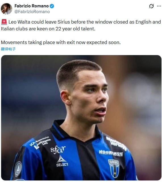 罗马诺在个人社媒写道:“莱奥·沃尔塔很可能在冬窗关闭前离开瑞典超天狼星俱乐部,因为英超和意甲球队对这位22岁天才很感兴趣,预计转会很快发生。”