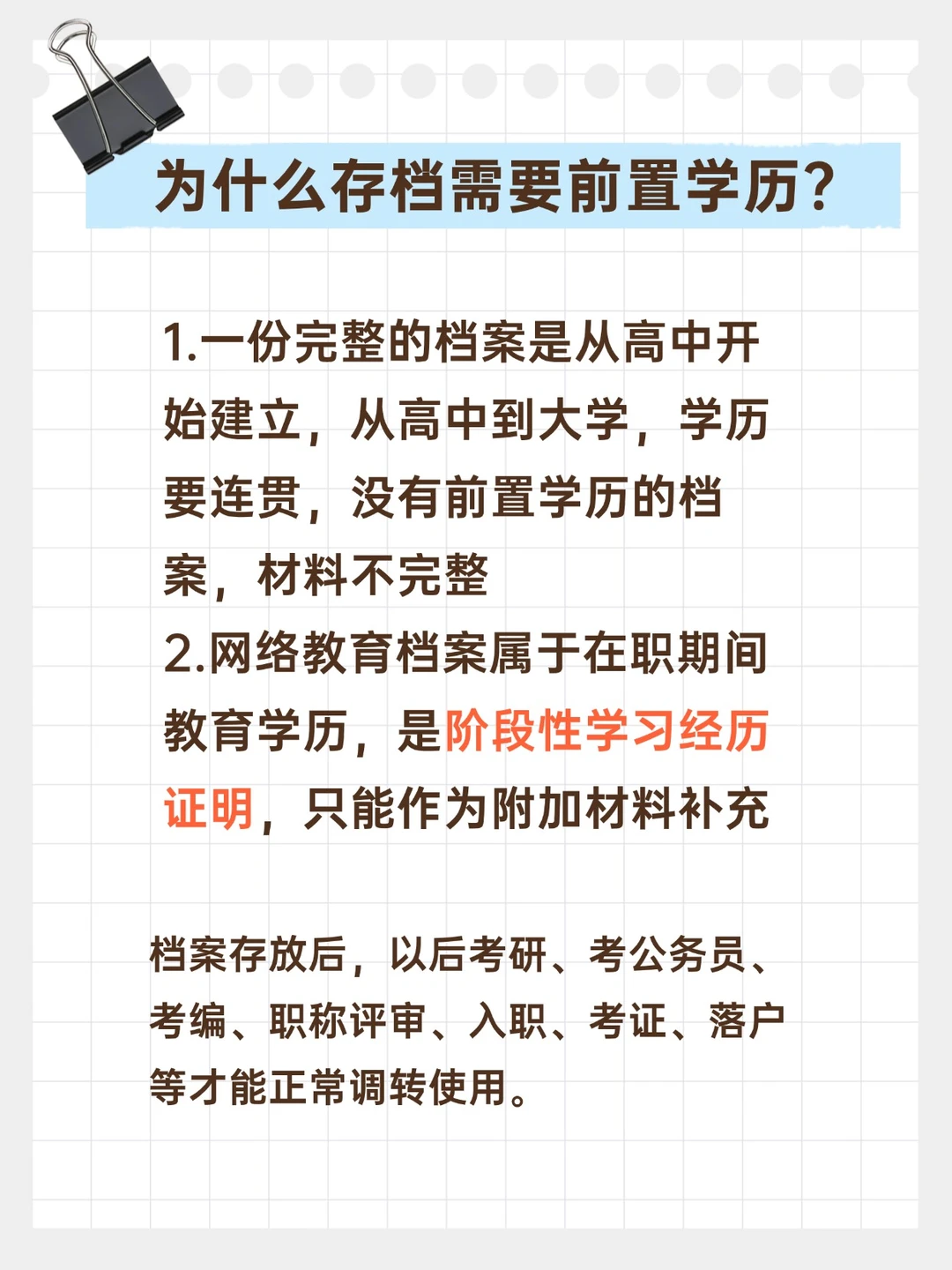 [二R].网络教育档案属于在职期间教育学历,是阶段性学习经历证明,只能作为附加材料补充!档案存放后,以后考研、考公务员、考编、职称评审、入职、考证、落户等才能正常调转使用。