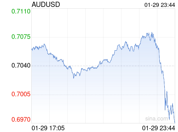 新浪外汇消息2026年01月29日,截至23时44分,外汇市场上澳元兑美元汇率跌破1澳元兑换0.6967美元。跌幅为-1.0369%