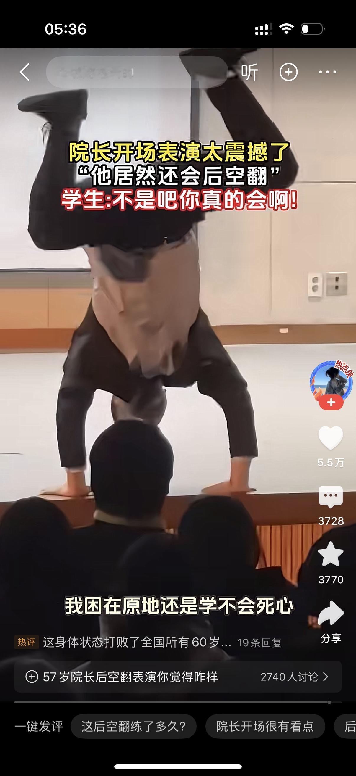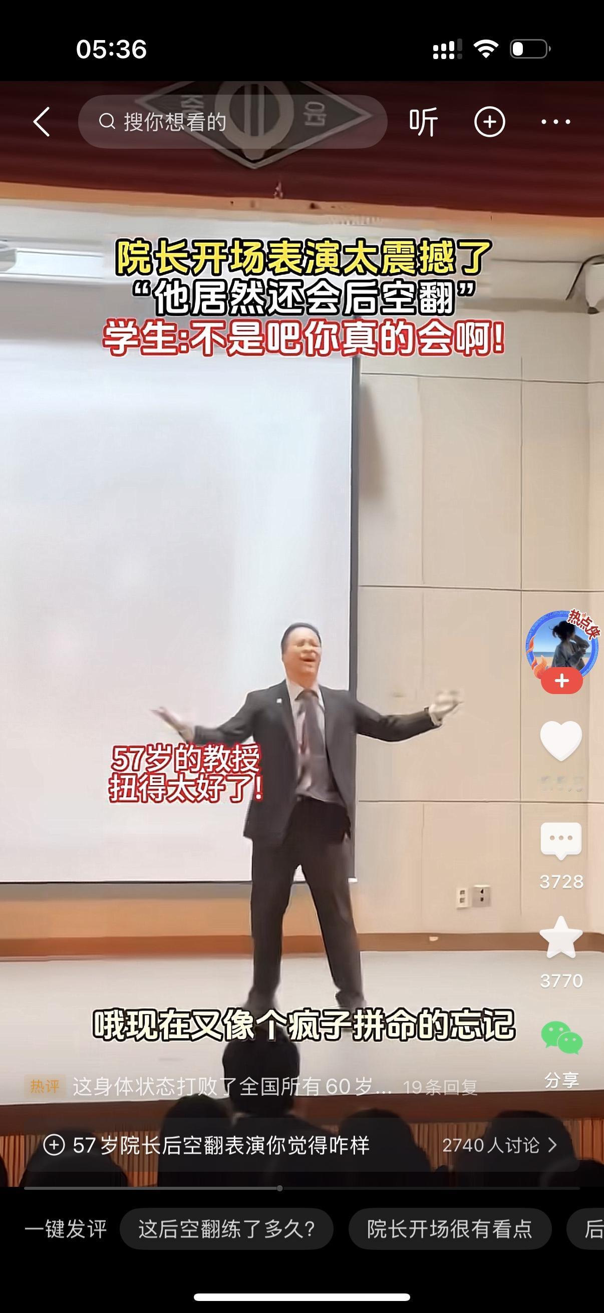 57岁的院长在大学生面前跳舞。他的表演太震撼了,哪像这个年纪的老人。人家不仅会扭,还会后空欢翻,赢得台下一片喝彩。学生们不禁感叹,不会吧,你真的会啊?这样的老师和学生们打成一片,这样的教授谁能不爱?他就是河南大学舞蹈学院的院长。