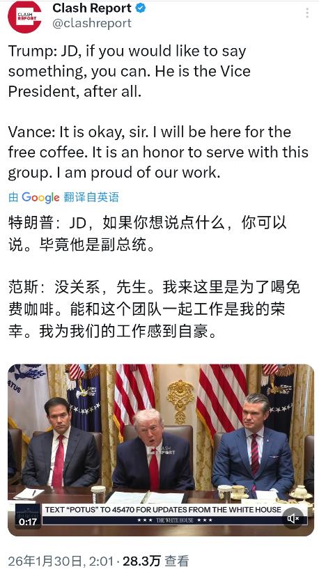 在今天(北京时间1月30日)的内阁会议上,特朗普:“JD,如果你想说点什么,你可以说。毕竟他是副总统。” JD万斯:“没关系,先生。我来这里是为了喝免费咖啡。能和这个团队一起工作是我的荣幸。我为我们的工作感到自豪。” 这场内阁会议分量不轻。特朗普当天抛出多个重磅消息。他公开表示已亲自请求普京同意对乌停火一周,理由是当地“异常寒冷”的天气状况。 他还宣布计划重新开放委内瑞拉领空,指令交通部长达菲与军方在29日结束前落实流程,多家美国石油公司已准备前往勘察。 经济领域的动作同样关键,他透露美联储主席人选将在下周揭晓,财政部长贝森特与商务部长卢特尼克均参与决策,同时强调“美联储利率太高,高得令人无法接受”。此外,白宫正与民主党人紧急协商,试图分离移民执法法案与政府资助方案,避免停摆危机。 特朗普主动邀请万斯发言的举动,透着刻意的考量。就在前一天,他还在内阁会议上回应“闭目养神”的质疑,坦言不会让所有成员发言,原因是上次会议耗时三小时太长。 这场会议仅持续1小时20分钟,国务卿卢比奥、国土安全部长诺姆等大员都未开口。在紧凑的议程中特意点到副总统,显然不是随意之举。 万斯的角色本就重要,他正牵头格陵兰岛及北极地区的合作谈判,与国务卿鲁比奥等人共同负责这一涉及北约盟友的关键事务。特朗普这句提醒,实则在强化副总统的存在感。 万斯的回应更耐人寻味。“喝免费咖啡”的调侃瞬间软化了会议的严肃氛围。这种轻松姿态与他几天前的强硬表现形成反差。 1月25日的白宫简报会上,他还在痛斥奥巴马的声明是“虚假新闻”,将抗议者的悲剧定性为“自找的”,全力维护MAGA阵营立场。 但在内阁核心会议上,他选择以谦逊姿态表态。这种转变藏着两层意思:其一,他清楚当天的焦点是总统宣布的多项决策,无需抢占话语权;其二,“为团队自豪”的说法精准呼应了会议传递的执政信号。当天特朗普反复强调经济成就,提及标普500指数创下历史新高,汽油价格大幅下跌,万斯的表态无疑是对这份政绩的侧面肯定。 两人的互动更折射出当前白宫的团队生态。万斯并非游离于核心决策之外的角色。他深度参与北极合作、移民谈判等关键议题,是特朗普政策的重要推动者。这种“不抢话但扛事”的定位,恰好契合特朗普的执政风格。 特朗普习惯在会议中主导节奏,从宣布政策到回应质疑都亲自把控,万斯的低调姿态实则是对这种权力结构的默契配合。有媒体捕捉到,会议期间万斯曾与国务卿卢比奥交换微笑,这种细微互动印证了内阁团队的协作状态。 从政治语境看,这段对话也是对外释放的信号。近期共和党内部因抗议者死亡事件出现裂痕,路易斯安那州参议员卡西迪公开呼吁联合调查,连全美步枪协会都罕见要求彻查此案。在阵营划线的敏感时刻,特朗普与万斯的良性互动,能对外展示核心团队的凝聚力。 万斯那句“为工作自豪”,既是对内阁近期成果的认可,也是对质疑声音的间接回应——白宫正按既定节奏推进议程,团队内部不存在分歧。 值得注意的是,万斯的表态并非空泛的客套。他负责的北极合作框架已取得进展,特朗普1月21日就透露与北约秘书长达成共识,这项方案将惠及所有北约成员国。 在委内瑞拉领空开放议题上,他虽未直接发言,但作为副总统必然参与前期磋商。这些具体工作支撑起他“为团队自豪”的底气,也让“喝免费咖啡”的调侃显得真实不做作。 这场简短互动最终服务于当天的核心目标。特朗普在会议上密集释放政策信号,从外交到经济全面发力,本质是在塑造强势执政形象。万斯的配合则让这种形象更具亲和力,避免了单纯政策宣告的生硬感。 对公众而言,“免费咖啡”的玩笑比冗长的政策解读更易记住,这种传播效果或许正是白宫团队想要达成的。毕竟在舆论场中,有温度的互动远比冰冷的决策更能拉近与民众的距离。