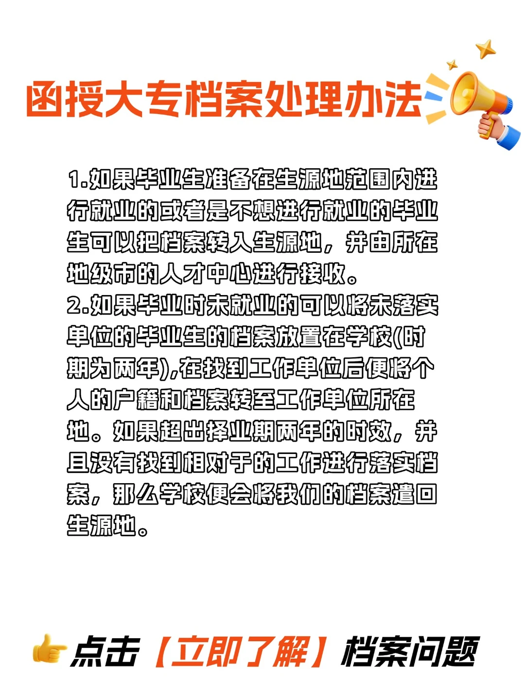 函授大专档案在自己手里赶紧这样处理!点击立即了解档案问题!函授大专档案的作用! [萌萌哒R]函授大专档案是有十分重要的作用的,它对入职国家机关、各级职称审评、落户需要、考取公务员、部分国企央企或者股份公司会对我们个人的档案进行查阅,了解自己是否有不良记录等情况,它还和我们以后的退休都有关系。 函授专科档案是有教育部进行电子注册,在学信网是可以进行查阅的,也是国家认可承认的学历。函投专科档案在找工作、职位晋升、报考公务员、报考教师资格证等都与统招专科学历的学生有着较为一致的作用。 [萌萌哒R]函授大专档案处理办法 [一R].如果毕业生准备在生源地范围内进行就业的或者是不想进行就业的毕业生可以把档案转入生源地,并由所在地级市的人才中心进行接收。 [二R].如果毕业时未就业的可以将未落实单位的毕业生的档案放置在学校(时期为两年),在找到工作单位后便将个人的户籍和档案转至工作单位所在地。如果超出择业期两年的时效,并且没有找到相对于的工作进行落实档案,那么学校便会将我们的档案遣回生源地。 [三R].如果毕业生想要进行创业或者灵活性较高的工作,可以将函授大专档案转到工作地附近人才交流中心进行托管。 [四R].最重要的是函授档案干万不要自留,档案自留极有可能出现档案破损或者遗失的情况,如若出现类似情况进行补办是相当麻烦的,所以喵喵还是提倡不要把档案留存在身边。