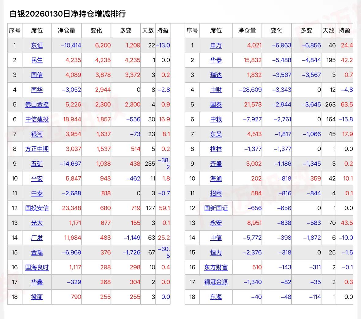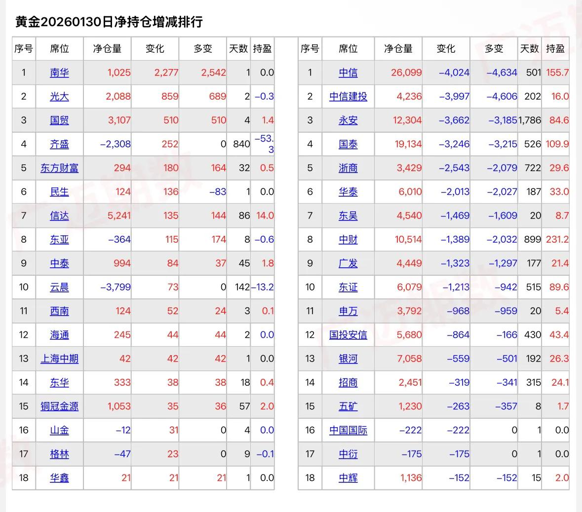 今天黄金白银各减持3万多手,中财,中信、国泰、华泰都在减多增空…