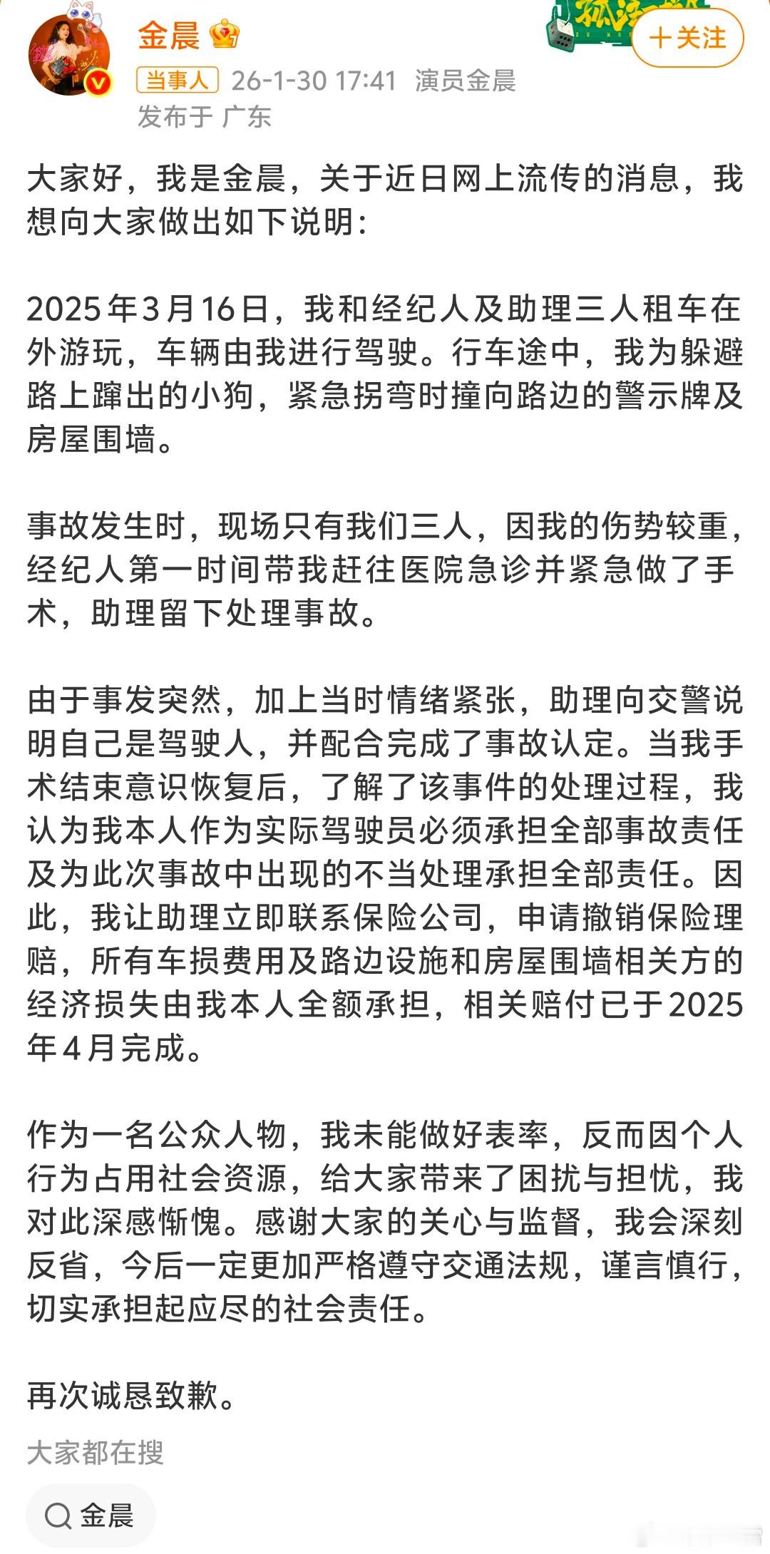 警方通报金晨事件信息量挺大的。金晨道歉1月30日,“柯桥J方”发布通报↓金晨当时因脸部受伤离开现场去处理伤,留下助理处理事故,助理着急谎称自己是驾驶人。后续报保险不存在骗保行为。
