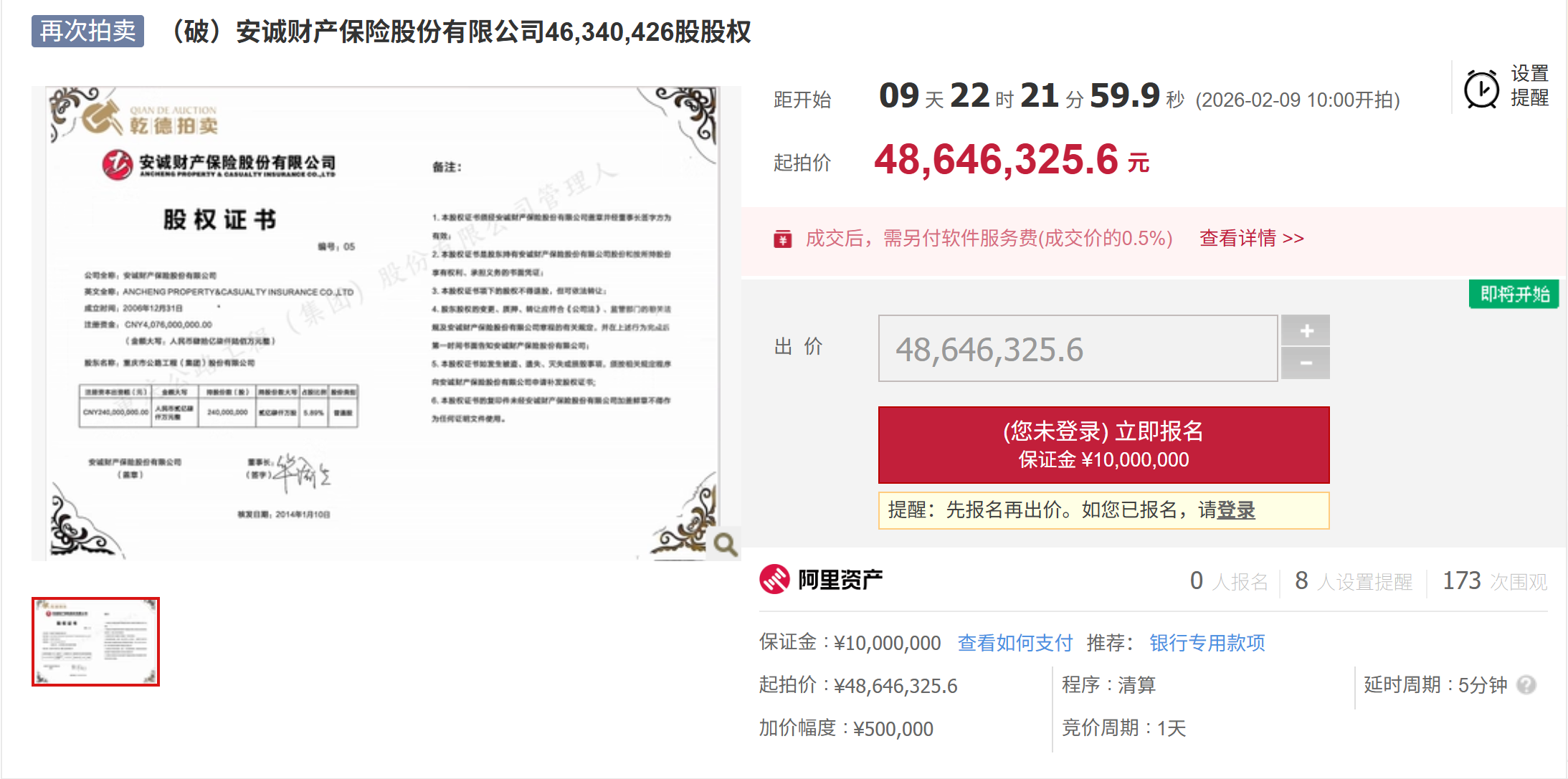 1月30日,记者从阿里资产拍卖平台获悉,安诚财产保险股份有限公司(下称“安诚财险”)1.815亿股股权将被拆分为两笔,于2月9日启动司法拍卖,合计起拍价1.91亿元。