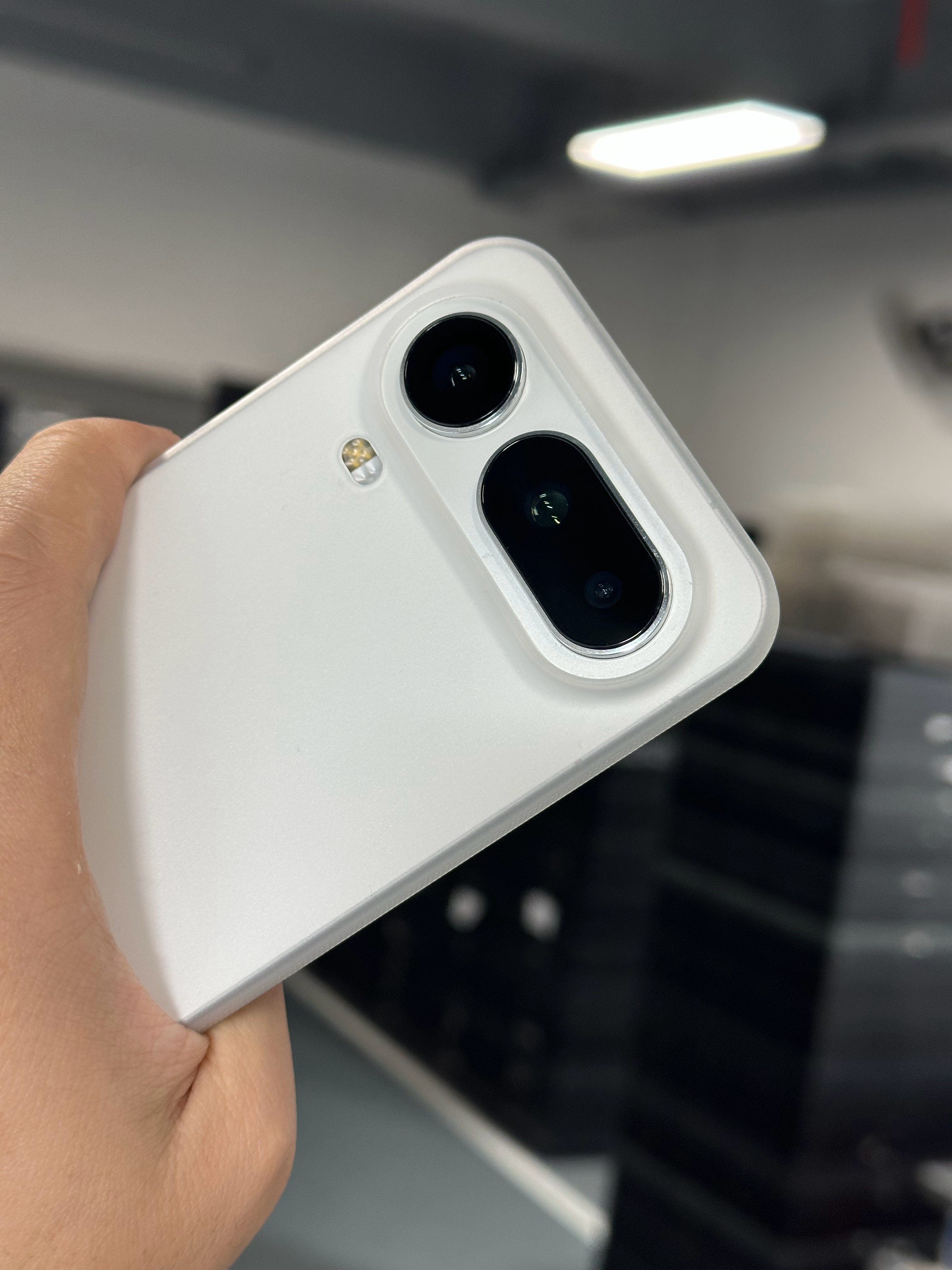 小伙伴从工厂发来的实拍图,先感受一下。一共规划四个颜色:半透,透黑,透紫,橙色。先上的会是透白,其他颜色会陆续到货上架。壳子厚度0.8mm,重量9克,pp 材质,无法内置磁圈,也就是没有磁吸的。AI 键是半废设计,可以按,触控不能用。如果裸机使用有误触情况的话,套这个壳子一样会有误触情况。高出屏幕约0.6mm,我们规划中的见峰1:1丝印玻璃 AR 膜厚度是0.4mm。壳子四个角会看得到金属边,不敢包多了,怕不好拆。今晚会搞点货回来,明天下午上