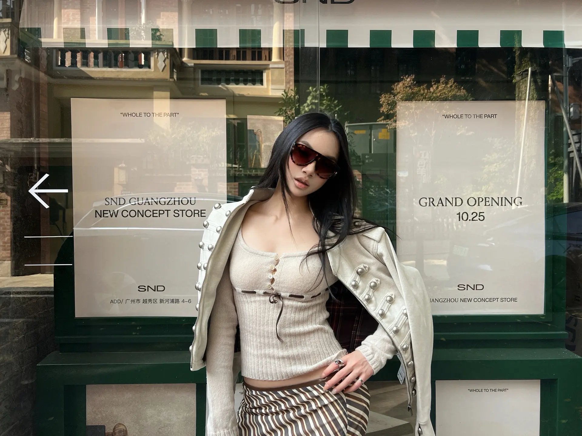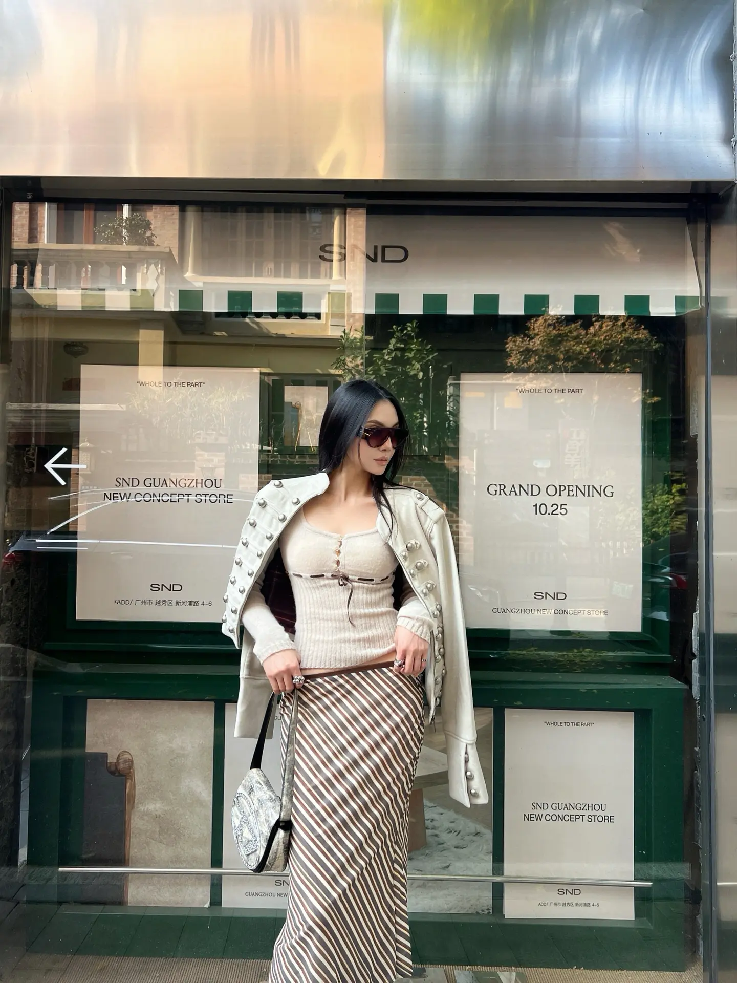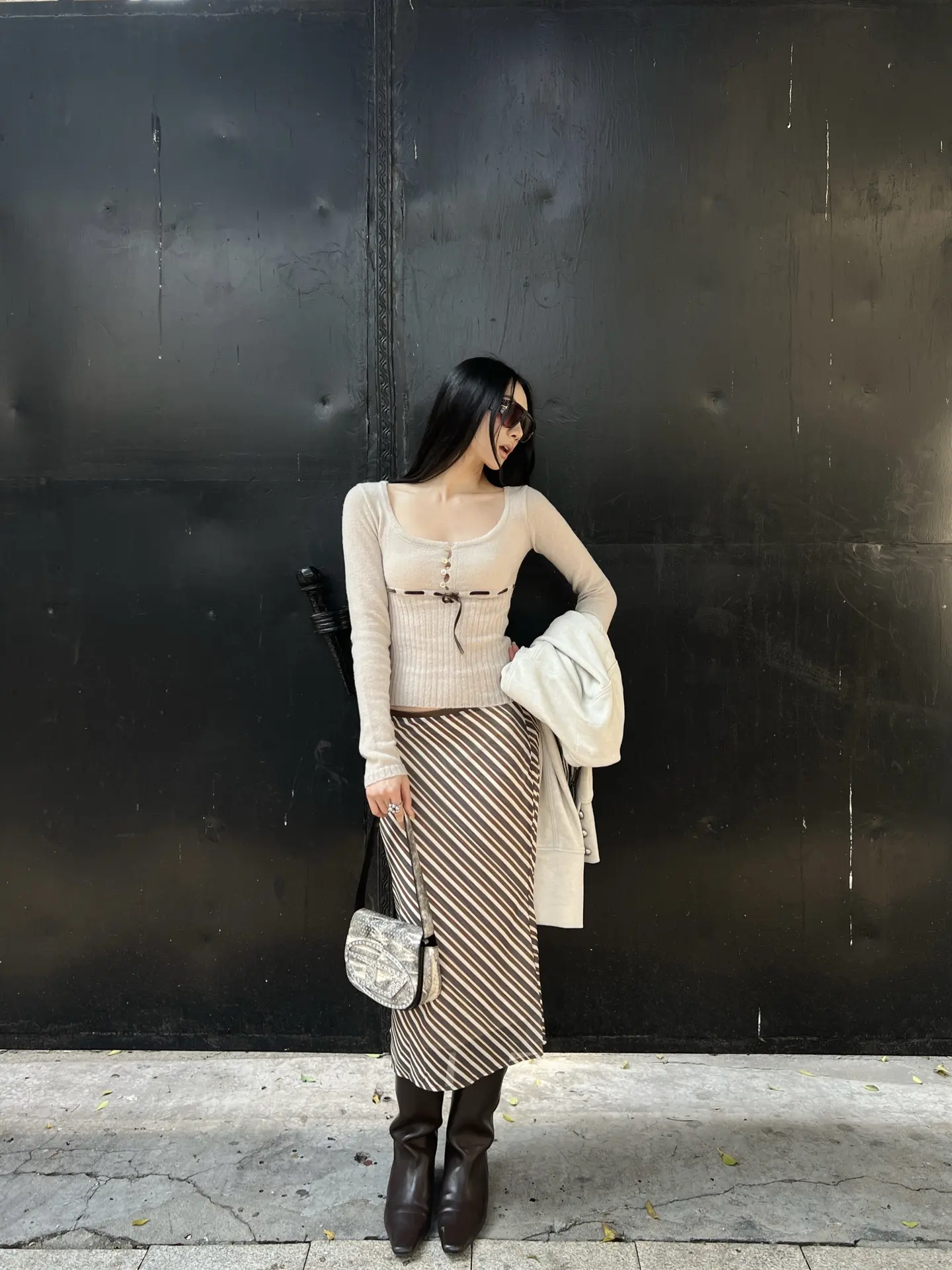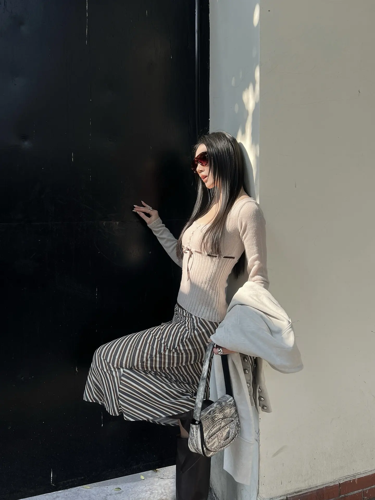 浅灰色针织开衫配米白短裤,温柔又显气质,再搭个精致小挎包,是适合踏青逛街的穿搭。