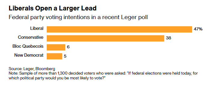 莱杰市场调查公司公布的一项新调查显示,自由党领先皮埃尔·波利耶夫领导的保守党9个百分点。此前,Liaison Strategies的民调也显示自由党领先8个百分点,其他调查则表明卡尼个人支持率正在上升。