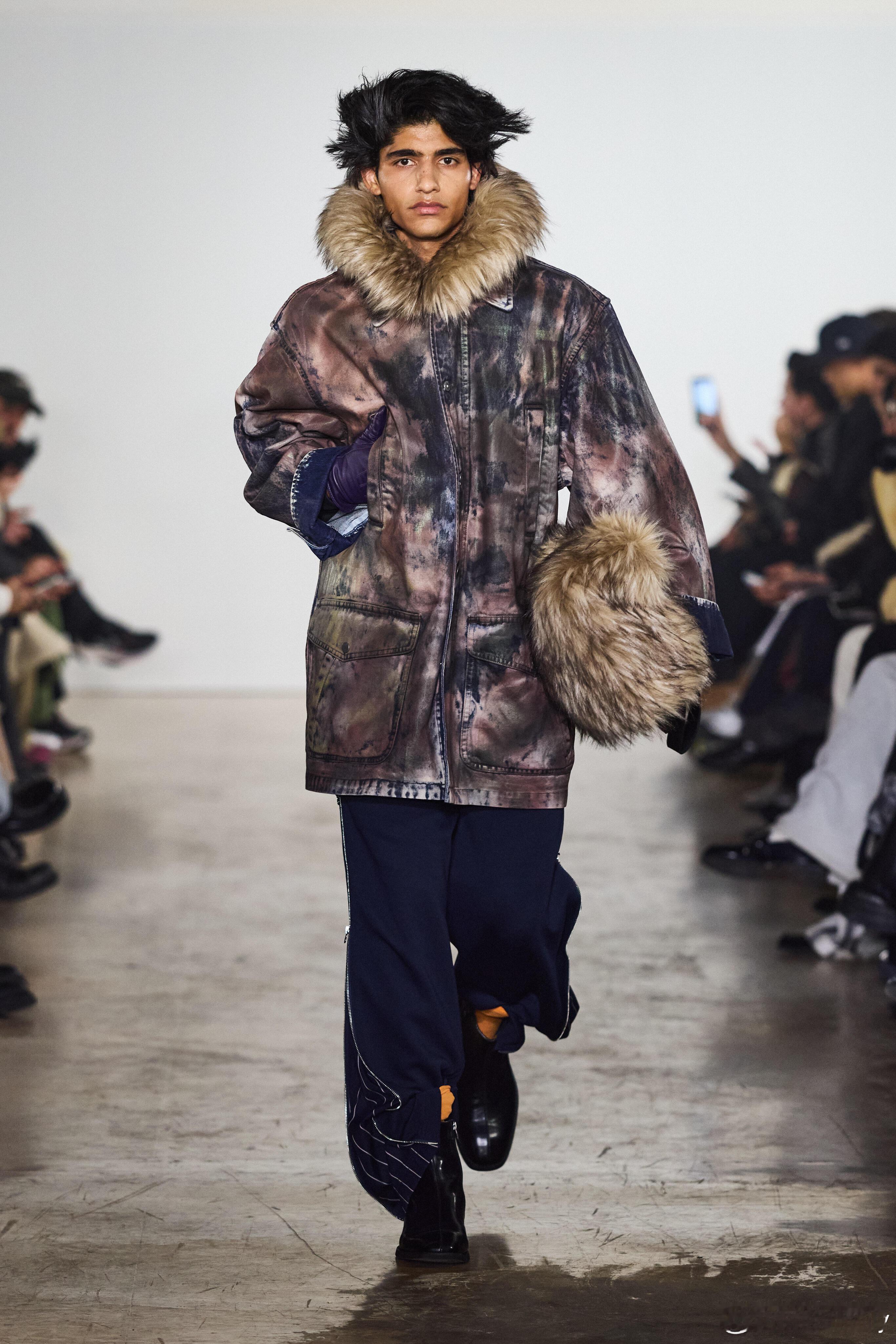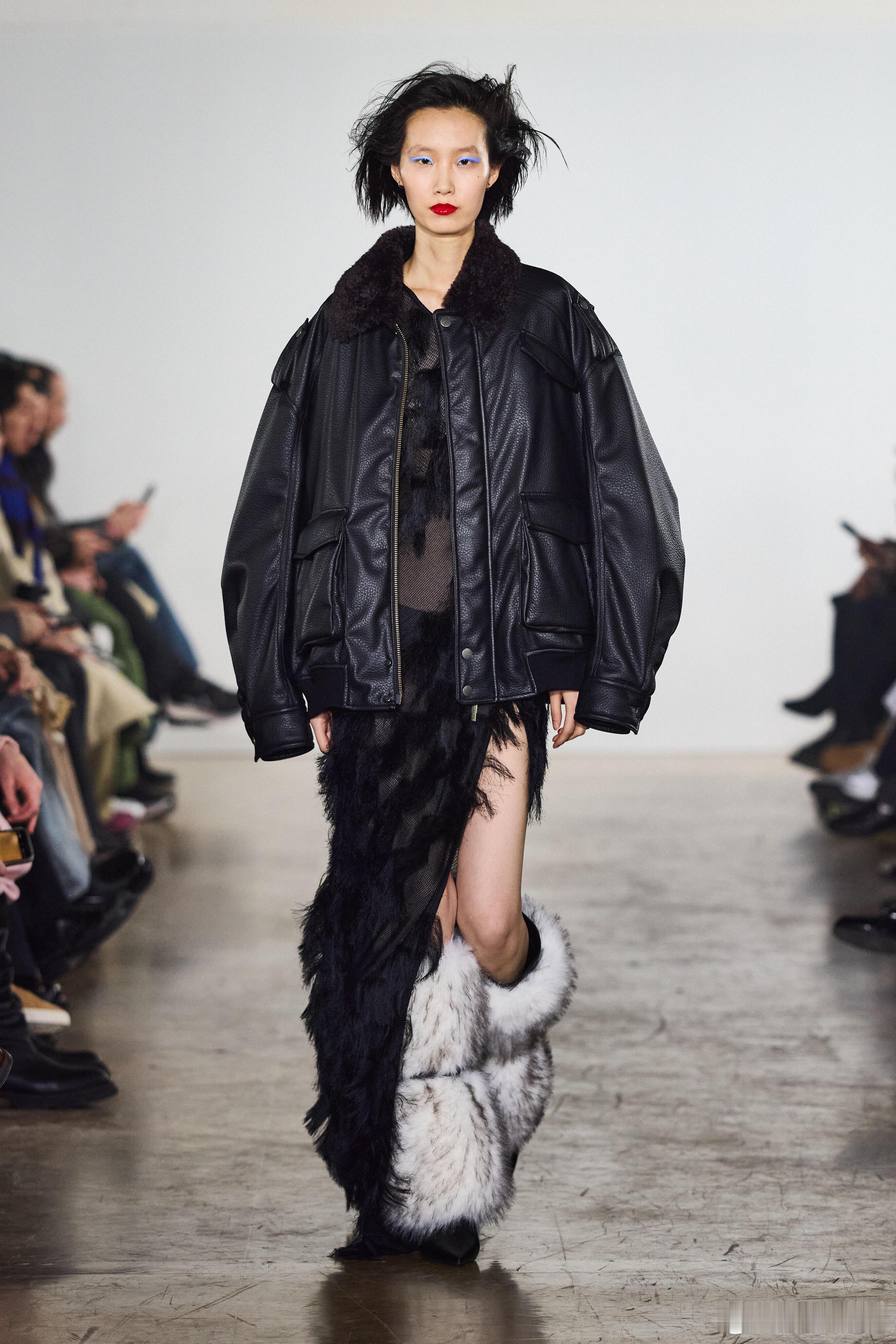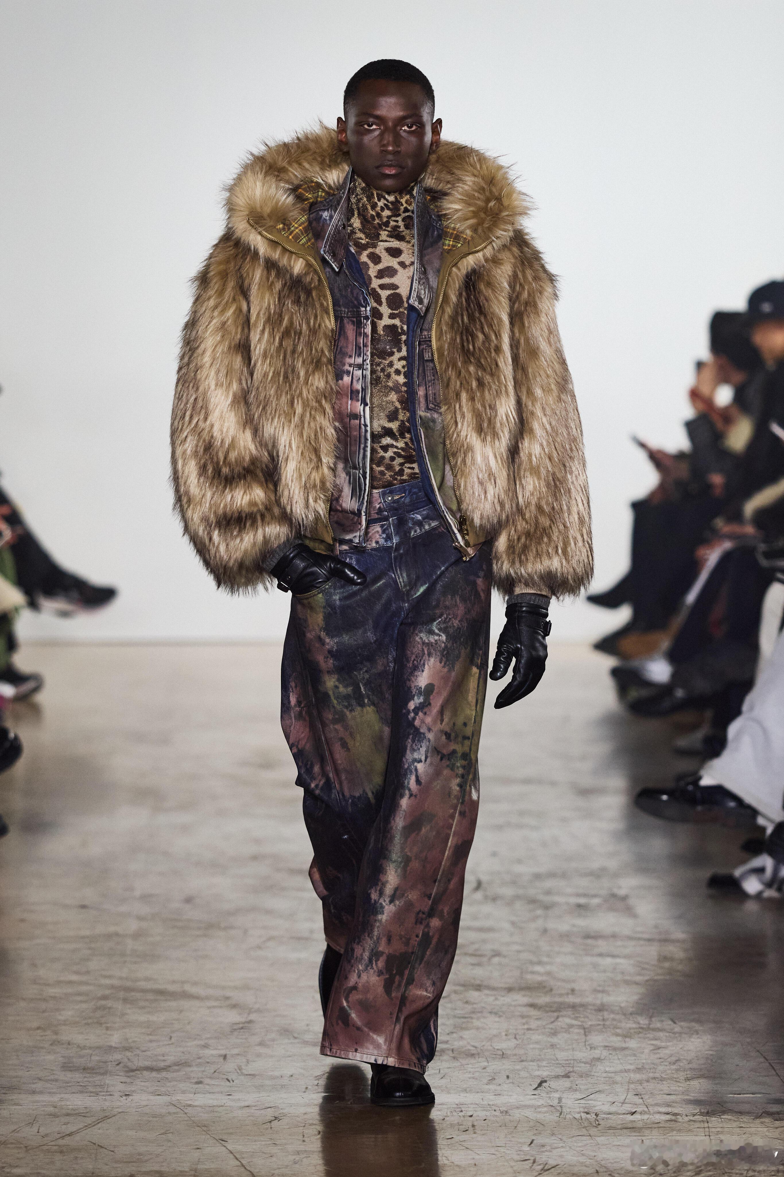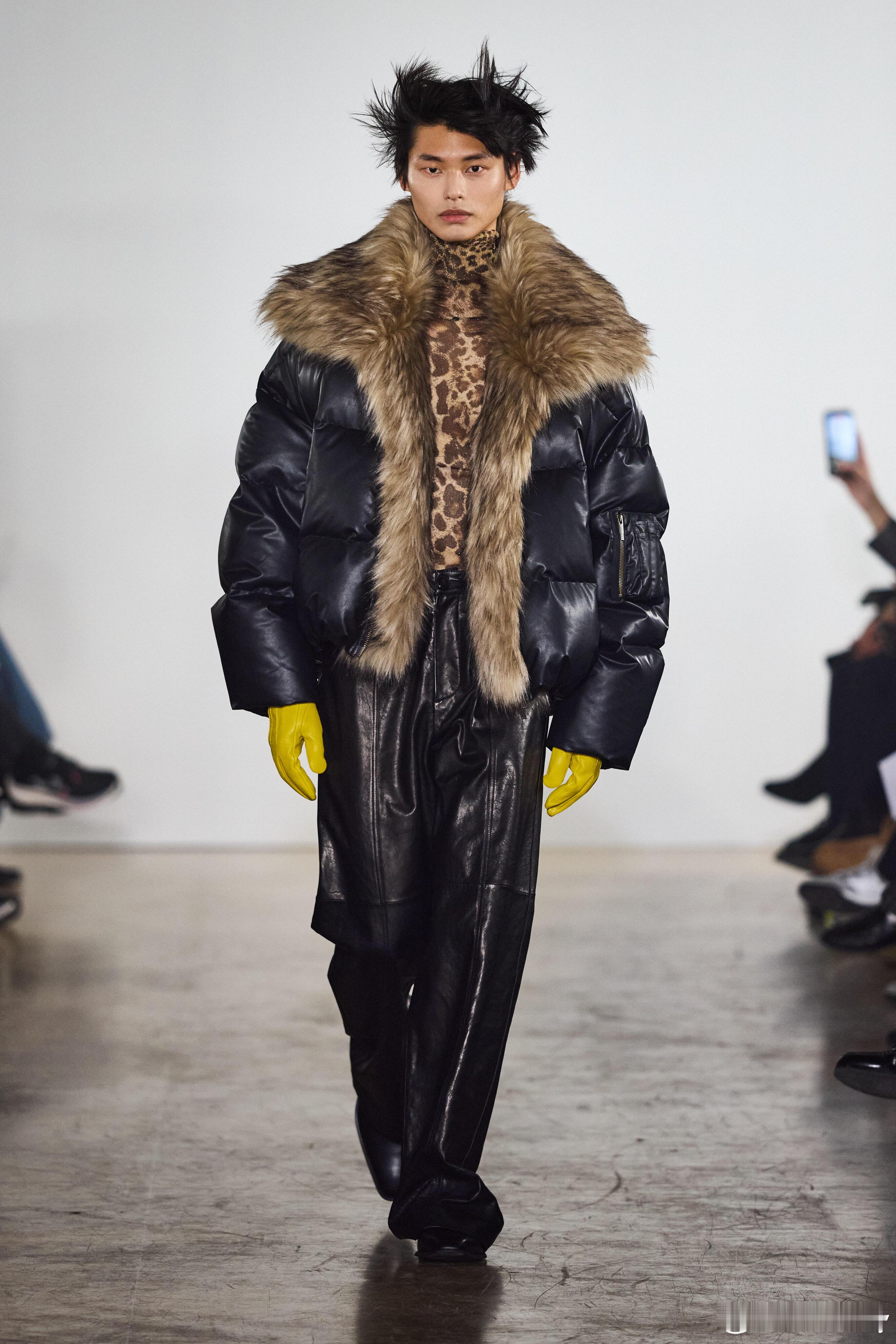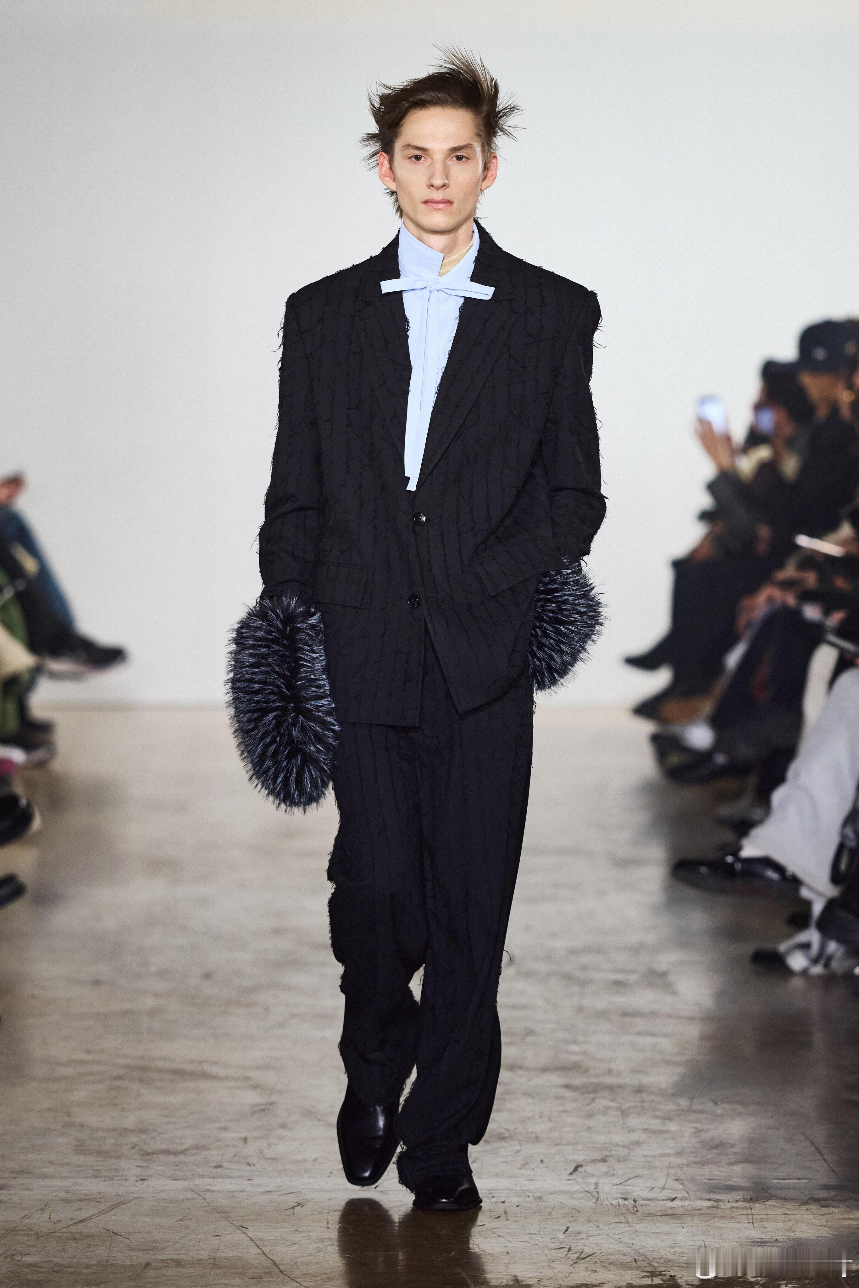 男装周 Feng Chen Wang AW26巴黎秀场巴黎男装周 中国设计师品牌Feng Chen Wang登陆2026秋冬巴黎时装周,以并行存在的力量为核心,萃取中国哲学“两仪”智慧,构筑名为“山海能量场”的时装叙事,在对立与平衡之间,书写东方设计的先锋表达。本季延续品牌对结构与功能的长期探索,将理性秩序与原始混沌纳入同一穿着系统。大衣与西装以建筑式剪裁锚定轮廓,利落线条勾勒秩序之美;松弛尼龙与放大比例消解刻板,在紧与松的拉扯中,达成身体与服装的动态和解。毛呢、羽绒、皮革构筑沉稳材质基底,轻薄织物与动物纹理穿插其间,以层次碰撞唤醒原始动能,让厚重与轻盈、规整与野性共生共融。工艺细节藏着东方匠意与当代实验的碰撞:丹宁经手绘涂鸦与多重洗染,留下时间反复书写的痕迹;针织与尼龙拼接,让色彩在硬朗结构中自然晕染扩散。恰逢马年新春,龙马神兽挂件成为贯穿全系列的视觉符号,既承载着生生不息的生命力,也以东方视角注解时间的循环与前行,为整场秀落下克制而厚重的注脚。秀场之上,人与动物形象并肩而行,将抽象哲学拉回真实的身体体验。理性结构与本能表达不再二元对立,而是成为推动设计演进的双重力量。这一季的Feng Chen Wang,打破“非此即彼”的审美桎梏,证明秩序与混沌、克制与张扬,皆可在时装经纬中息息相行,于旷野中守定力,于冲突中向新生。大秀直击