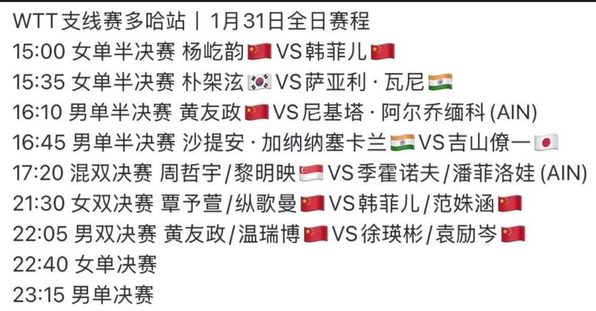 WTT多哈支线赛1月31日赛程——小将黄友政晋级男单半决赛 1月31日,多哈支线赛经过几天的激烈角逐,比赛已经进入最后阶段, 国乒小将杨屹韵和韩菲儿进入 女单半决赛,虽然在同一个半区, 但确保一个晋级决赛! 男单方面, 小将黄友政过五关斩六将, 冲进决赛,真棒👍, 黄友政涨球啦! 恭喜国乒提前包揽男女双打冠亚军, 不容易啊, 双打是奥运会金牌项目, 重点培养双打梯队队员, 国乒队的双打又给我们带来惊喜, 支线赛多哈站, 国乒小将奋力拼搏, 成绩喜人, 关注比赛, 给小将们加油助威!