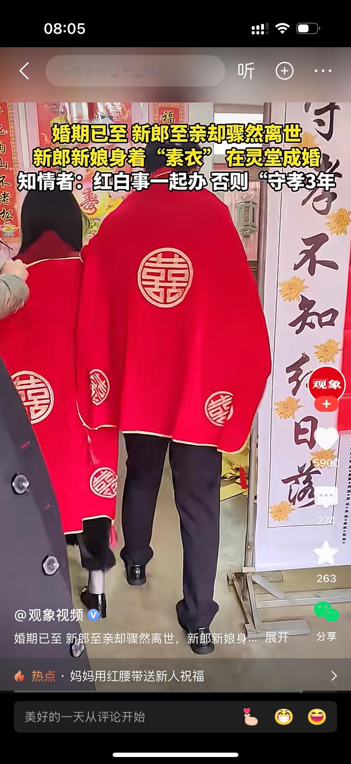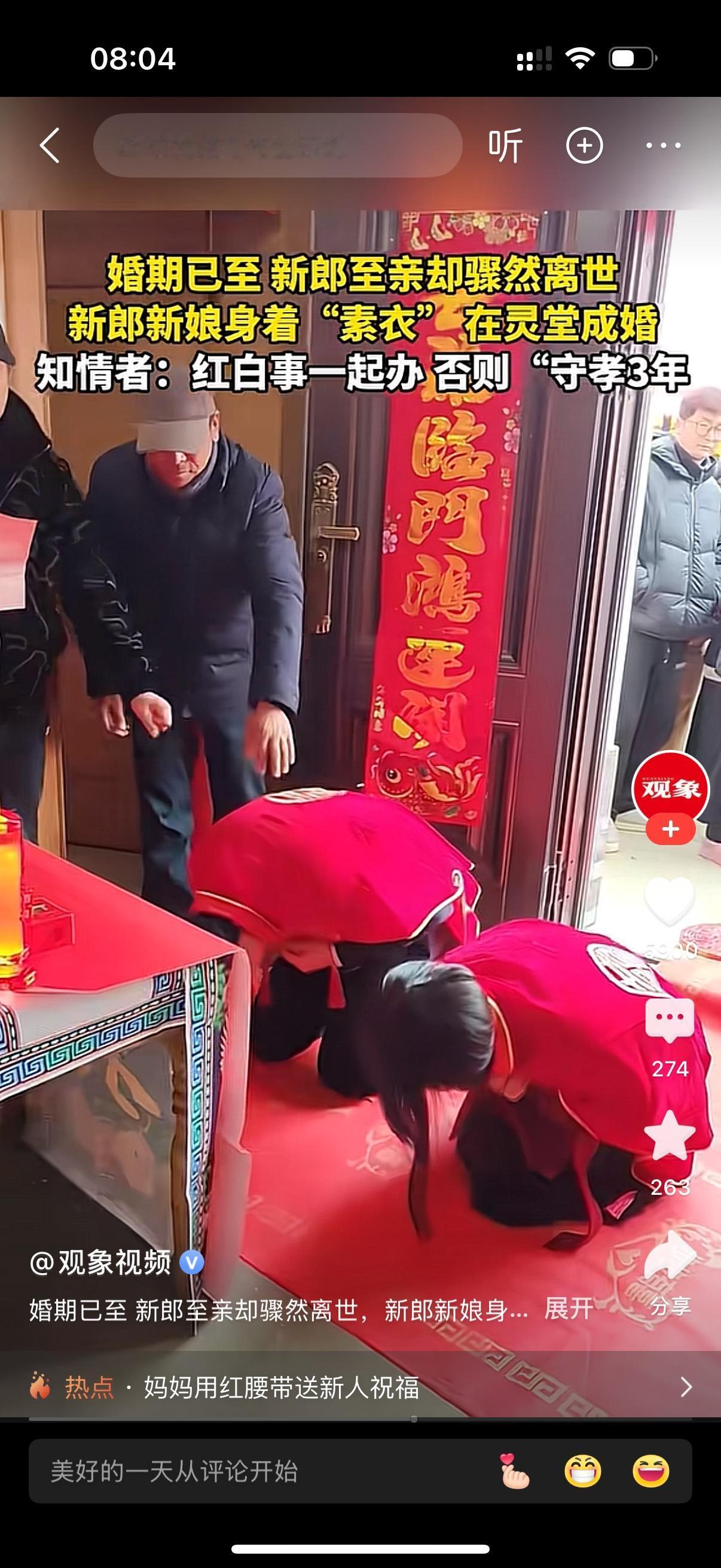 婚期已至,新郎至亲却骤然离世。家里老人说红白喜事只能一起办,否则守孝三年。新郎新娘只能穿着素衣在灵堂成婚。这一刻也不知道她们的心情是悲还是喜?真不知道为什么现在还有这种守孝三年的陈规陋习?可能只有等50年代,60年代的老人都去了,就不会有这种奇葩的规矩了。