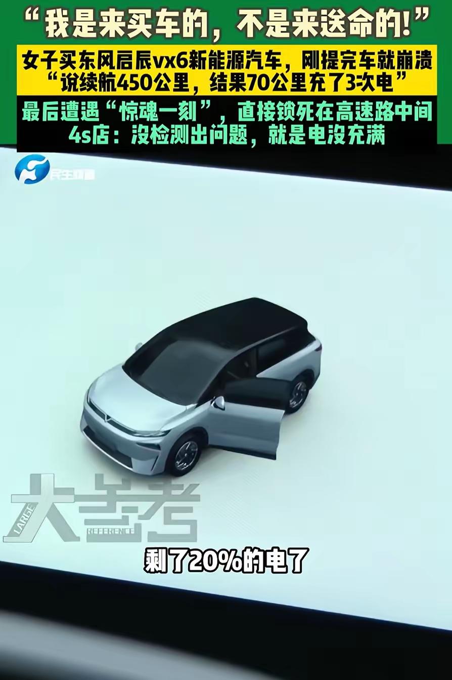 我快吓死了!”河南郑州,女子买了一台新能源汽车,提车当天,喜滋滋的到店里,把电量充到97%后就准备上高速回家,万万没想到,说好的续航450公里,结果仅跑了70公里就充了3次电,甚至还在高速上趴窝,女子彻底破防了:我是来买车的,不是来送命的! 这位车主攒了很久的收入才买下这台新能源汽车,下单前对比了多款车型,就是看中官方标注的450公里续航,觉得日常代步、跑短途高速完全够用。销售在沟通时也明确说明,车辆日常使用足够稳妥,低温环境下的续航表现也在正常范围,不会影响正常上路。提车当天她按照流程完成所有手续,店里工作人员把电量充到97%,告知车辆状态正常,她怀着新车到手的好心情开上高速,根本没料到会接连出现状况。 郑州近期气温多在0℃左右,低温环境确实会影响新能源汽车动力电池的活性,实际续航和官方数据存在一定差距,这是很多车主都知道的行业情况。就算加上高速行驶、车内开启暖风的条件,450公里续航的车型,实际里程也不该出现如此夸张的缩水。车主在70公里的路程里,电量快速下降,不得不三次进入服务区充电,排队等待加上充电耗时,把原本轻松的回家路变得格外煎熬。 真正让车主感到害怕的,是车辆在高速行驶途中突然失去动力,直接停在路面上。高速上车流量大,后方车辆行驶速度较快,突然停驶的车辆很容易引发追尾事故。车主当时只能快速打开双闪,按照交规放置警示标识,站在应急车道等待救援,刚提的第一天新车,就让自己身处交通危险之中,这样的经历,换成谁都会接受不了。 车主事后找到4S店反映问题,希望店家检查车辆故障,给出合理的处理方案。可门店给出的答复,只是将问题归结为充电状态与用车环境,声称检测后没有发现车辆故障,既没有深入排查电池与电路系统,也没有给出对应的售后处理方案。这样的处理态度,也是让车主彻底崩溃的主要原因。 从近几年的消费投诉数据来看,新能源汽车续航虚标,一直是投诉量居高不下的问题。很多车企宣传时使用的续航数据,都是在实验室恒温、匀速、无额外负载的理想条件下测出,和北方冬季、高速行驶的真实用车场景差距很大。不少品牌在宣传时只突出最高续航数字,很少主动告知用户低温、高速、满载等场景下的真实续航情况,消费者很容易被宣传数据误导。 大家可以接受正常的技术折损,也能理解行业现阶段的客观局限,但续航直接缩水到标称里程的零头,还在高速上出现动力异常,已经不是正常的续航衰减,而是直接影响行车安全的问题。车企和经销商不能只注重宣传数据,忽略车辆实际使用中的安全与体验,更不能在出现问题后,用笼统的理由回避责任。 新能源汽车市场发展越来越快,用户选择新能源车,是为了出行更方便、用车成本更划算,不是为了在高速上担惊受怕。车企应该真实公示多场景下的续航数据,完善车辆品控与故障检测流程,经销商也要落实售后责任,主动帮用户解决实际问题,而不是一味推卸责任。 消费市场的长久发展,靠的是诚信与品质,不是靠包装出来的宣传数据。只有正视产品问题,保障消费者的安全与权益,新能源车行业才能走得更稳更远,也才能让更多普通人放心选择、安心用车。 各位读者你们怎么看?欢迎在评论区讨论。