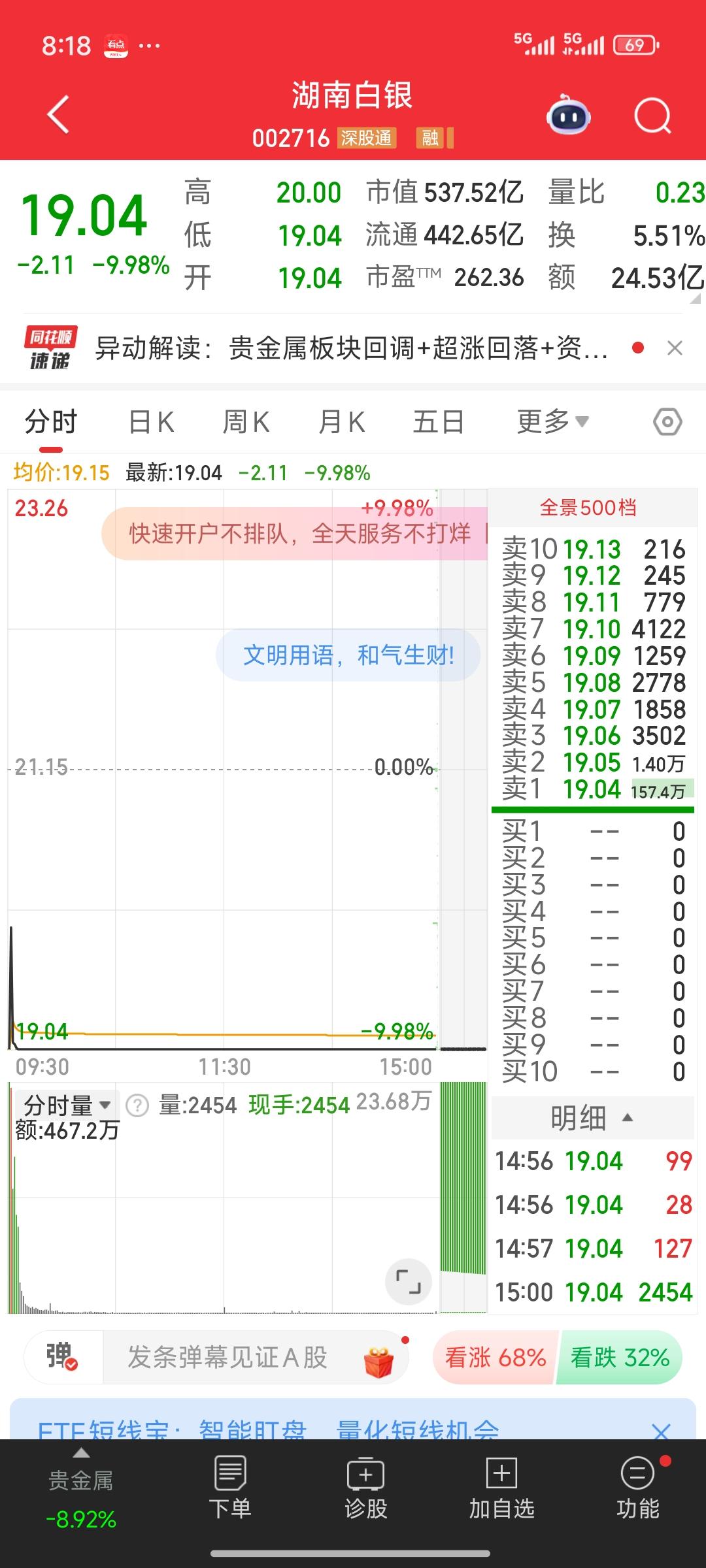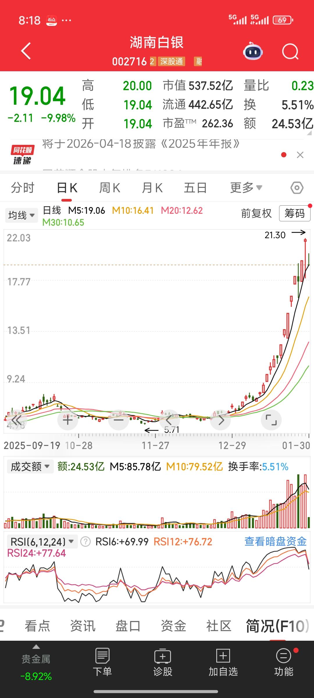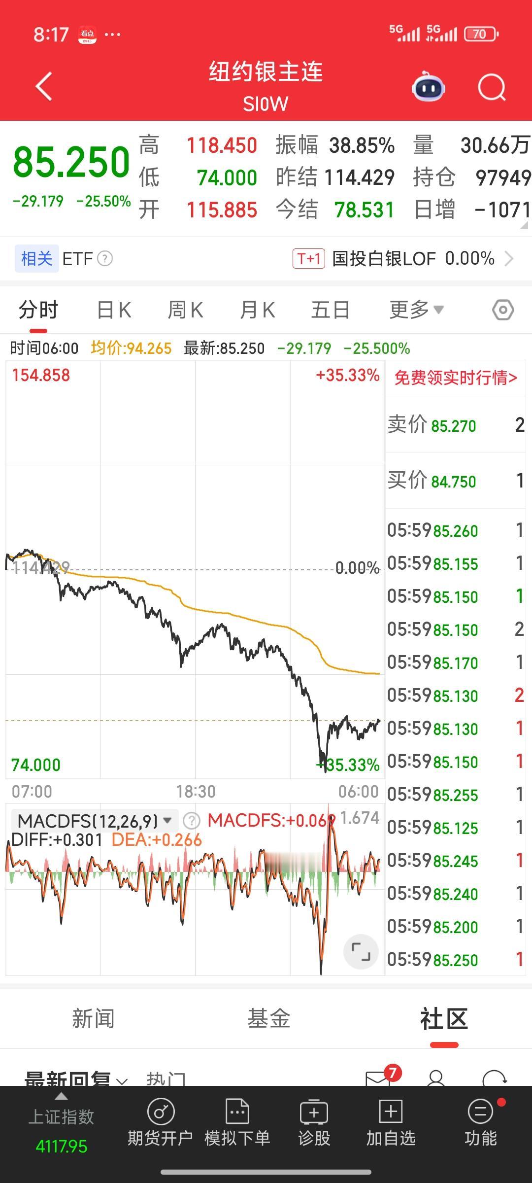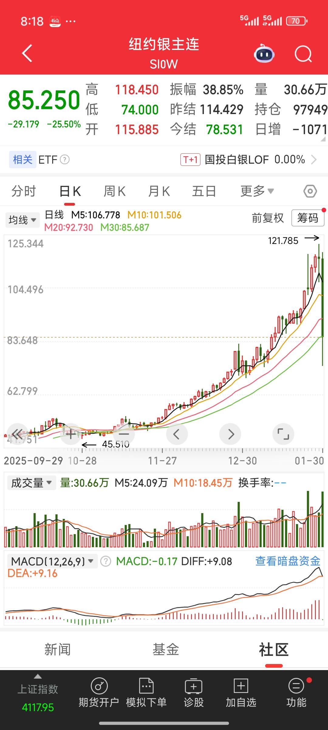 天塌了!天塌了! 期货市场的金银,昨夜在国际市场大幅下跌。白银期货一度跌幅超35%,收盘时仍有二十几个点的下跌;黄金跌幅也超10%,收盘仍有将近8.5%跌幅。这无疑是一场断头杀。市场情绪的沸点意味着行情随时转折到来。 再瞧瞧国内白银三剑客,湖南白银,白银有色,豫光金铅!预计下周大概率还是会一字跌停,可能还会有好几个跌停板,拦腰斩都极有可能。投资者被困其中,根本无法脱身,痛苦不堪。 这又是一个血淋淋的教训啊!一定要避免头脑发热。当你极度渴望买入、追高进场时,其实恰恰是该卖出的时候。