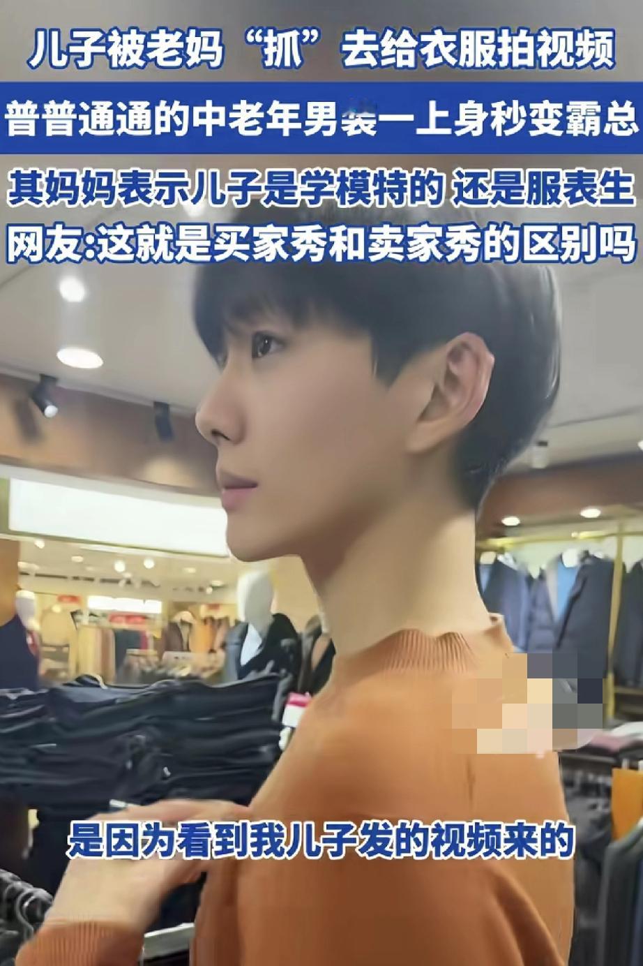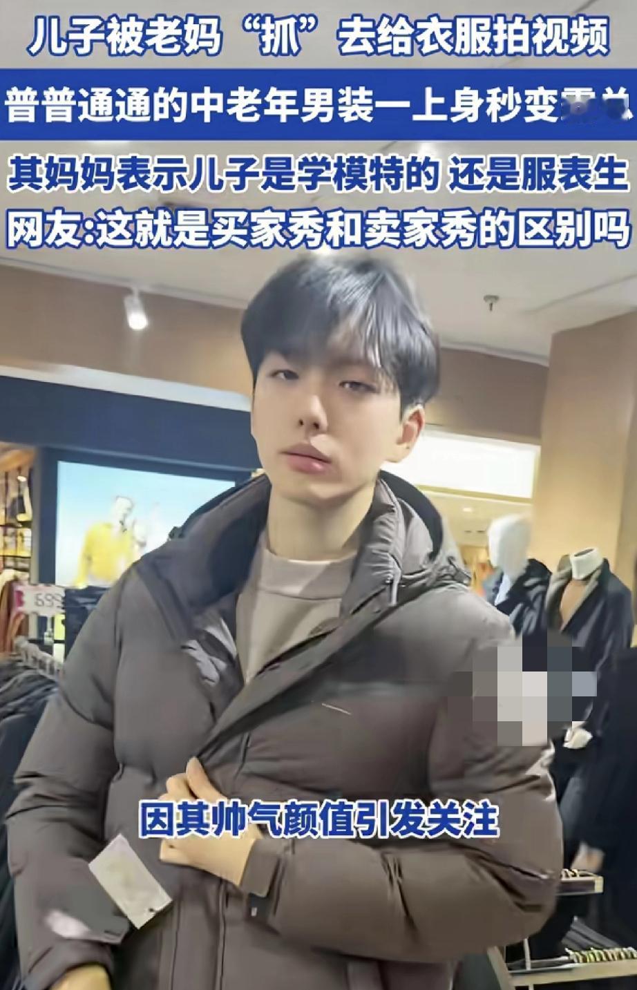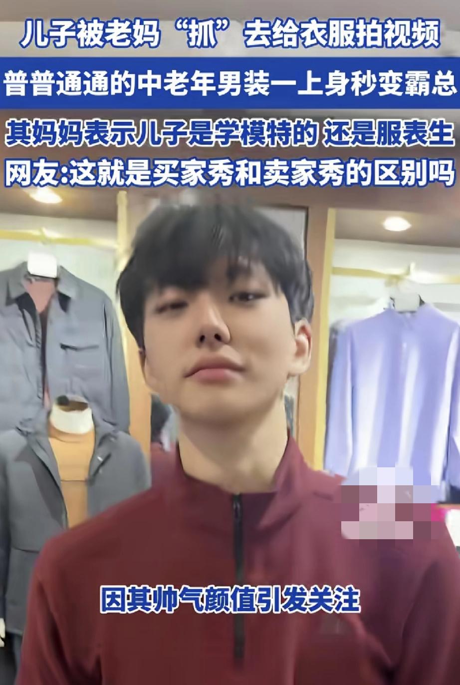 山东烟台,一妈妈让帅气儿子,试穿自家21年服装老店的中老年服饰,不料将儿子试穿视频发到网上后,竟意外带火了自家老店。视频可见,儿子不但长得得帅气,这身材也是非常高大,且只要他一穿上店内的这些中老年服饰,无论是中年的还是老年的,都显得帅气逼人,特别的合身好看。 据妈妈表示,她也没有想到,只是突发奇想让儿子试穿一下这些中老年服饰,然后随手一拍就发到网上了,结果还真把店子给带火。 现在店铺火了,也有很多人咨询店铺买衣服的,平日里人流量也增多了,可大多数都是看到儿子视频后,来探店的女性顾客。 妈妈还称,她的儿子身高186cm,暂无女朋友,3月份就要开学返校,且学习的是模特专业。不过儿子看到妈妈店铺被自己带火了,心里很高兴,毕竟帮妈妈把店子宣传出去了。 而此事也是引起了网友们的一片热议。有网友就表示:果然还是专业对口了,第一次宣传就这么成功,是个做模特的好苗! 还有网友表示:看来帅气出圈不是吹的,这波流量密码被死死拿捏住了,说明只要会玩梗,传统店铺也能在网上火起来! 更有网友表示:有个这么帅气的儿子为自家店铺做广告,不火才怪了!建议卖点女装生意会更好,男的对他不感兴趣[捂脸] 不得不说,这就是论颜值的重要性!这位帅小伙穿上这些衣服后,怎么看也看不出来是中老年装啊,可谓是件件都帅气又合身!这说明,只要你年轻穿什么都年轻帅气咯!当然网友的提议也不错,建议卖点女装抓住这波流量! 对此大家怎么看?