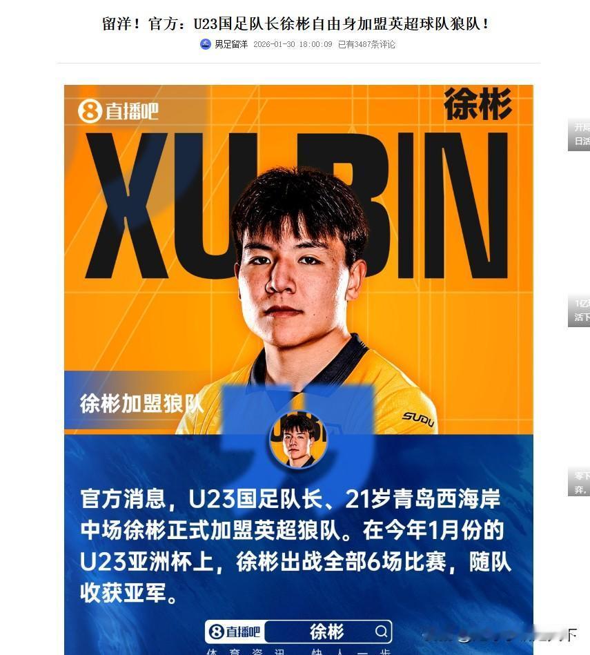 这牛逼了,徐彬加盟英超狼队,目前在梯队,然后大概率租借去英甲。 而且狼队为了徐彬用了一张劳工证外卡,看来狼队还是很看好这位未来之星的。 其实我觉得中国球员应该先去一些低级别联赛练练比如比甲,荷甲,苏超这些。一来就去五大联赛很难有上场机会。 不知道徐彬在英甲、英冠能不能踢明白,能不能有出场时间,如果上不了场那出去也没意义。 不过仔细想想日本很多球员也都是加入了欧洲的日资俱乐部起步的,徐彬能走出来就是进步了。