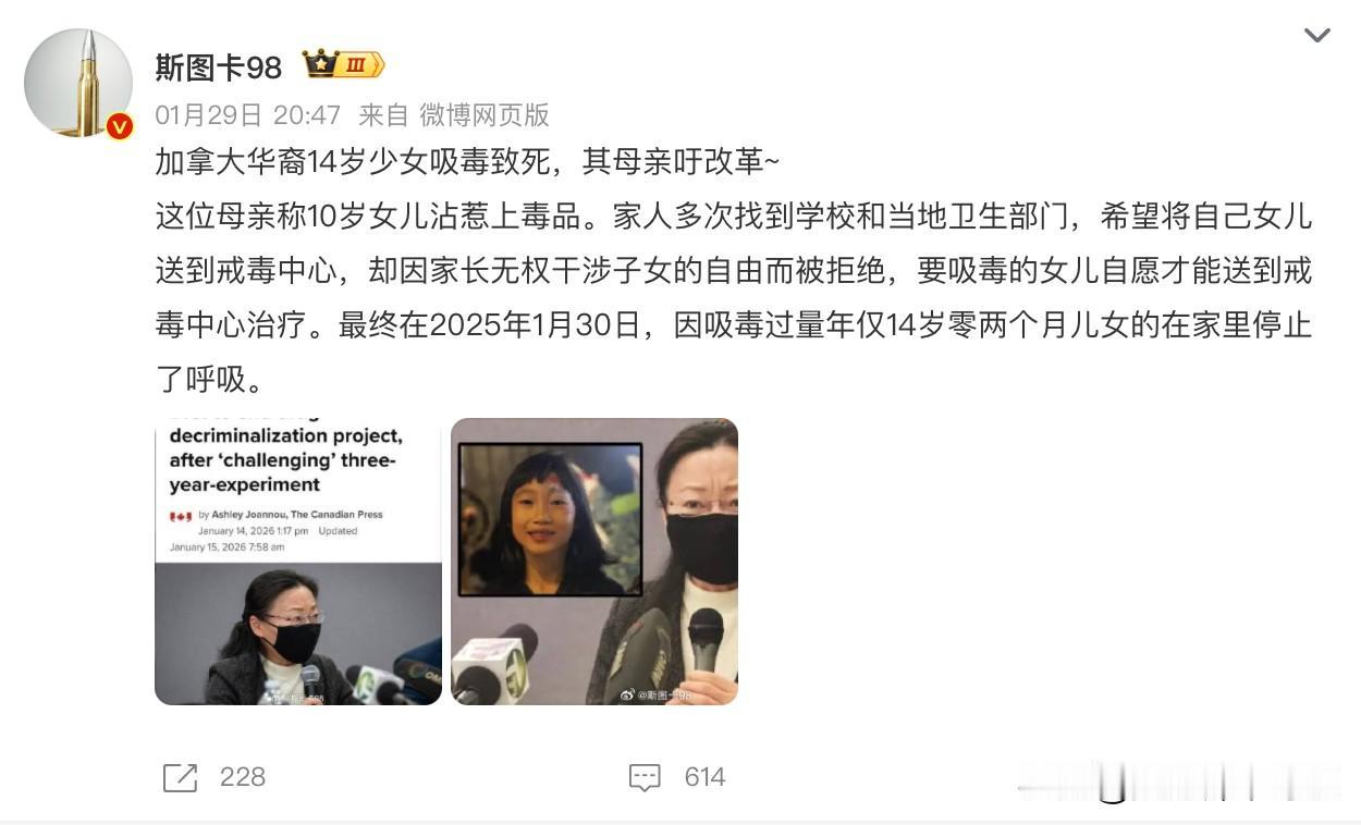 昨天一则热搜看得我不寒而栗,说一加拿大华裔少女10岁开始就吸上了,14岁就因吸而去世!老铁们想象一下10岁时还是个儿童,是怎么上瘾的?大概率是有人专门引诱吧。况且,其家长多次向有关部门反映,并想将其送去戒断!可人家将其拒绝了。理由是家长无法干涉儿童自由,要自愿才能送去戒断!当然这件事情目前还没看到正式媒体报道,请老铁们谨慎吃瓜。假设这是真的,那就太魔幻了,联想到牢A的斩杀线理论和最近流行的三通一达梗,这就有点逻辑自洽了!