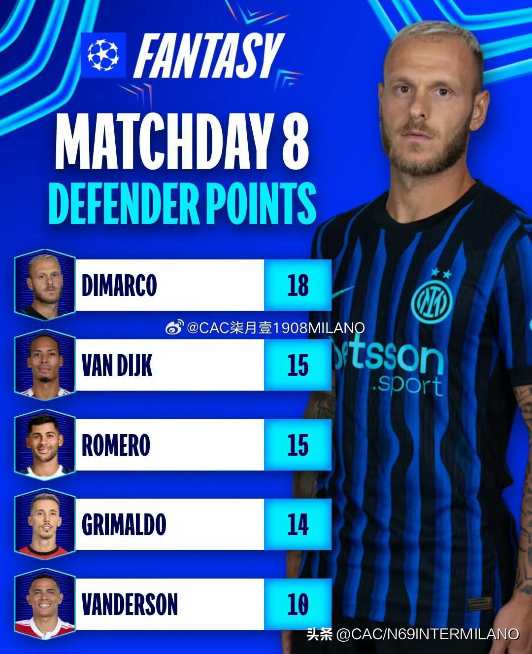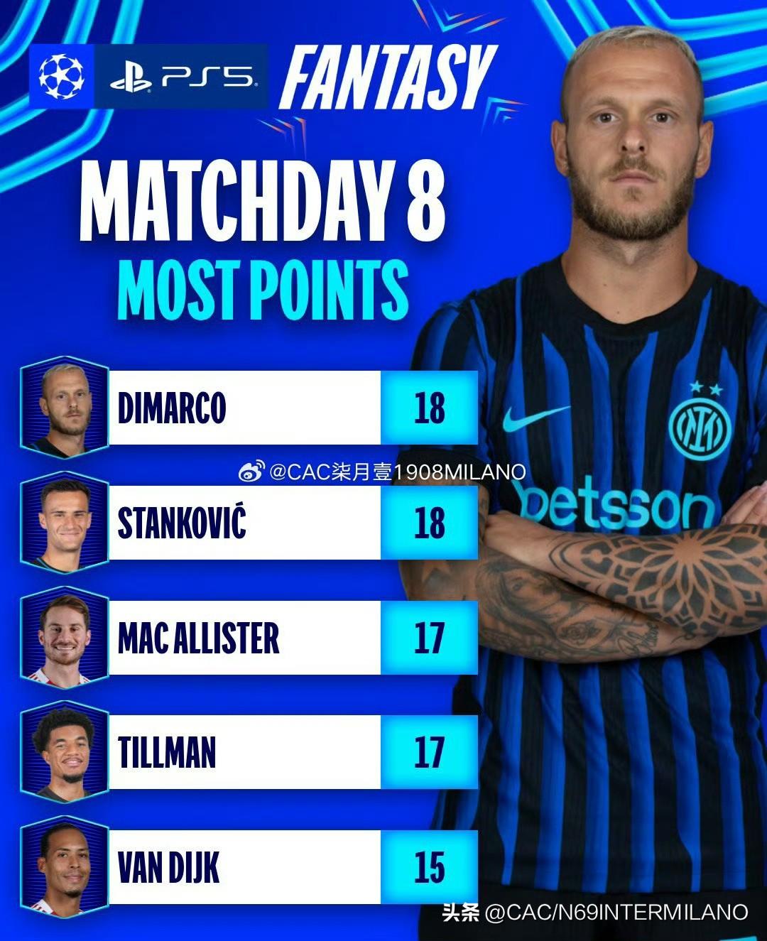 本轮欧冠最佳阵容迪马尔科入选, 迪马尔科和斯坦科维奇又互动起来, 俩好兄弟一起霸榜本轮欧冠联赛榜, 张康阳社交分享迪马尔科破门瞬间, 本轮迪马尔科任意球破门是意大利球员 自欧冠2014年11月25日首粒任意球直接进球 上次是遥远的12年前托蒂对阵莫斯科斯巴达克时。 迪马尔科最近6场比赛打进4球,送上2次助攻, 帕尔马,那不勒斯各打进1球,比萨1进球2助攻, 欧冠打多特1进球,两场MVP,平均分全队最高, 2025五大联赛意大利球员射手榜,太子排第四位, 除了他其余全是前锋。骄傲,致敬,迪马尔科!💙🖤