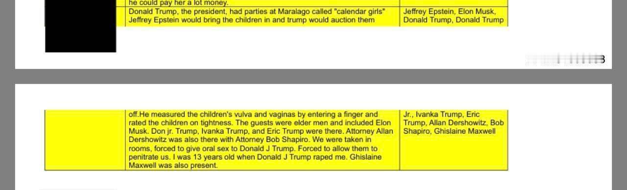 📍文件中包含据称在特朗普庄园和牧场发生的性派对的受害者证词。据称,总统会引诱女孩进行性行为,其中包括一名13岁女孩,并将她们“拍卖”给其他富有的派对参与者。一些女孩随后失踪了。