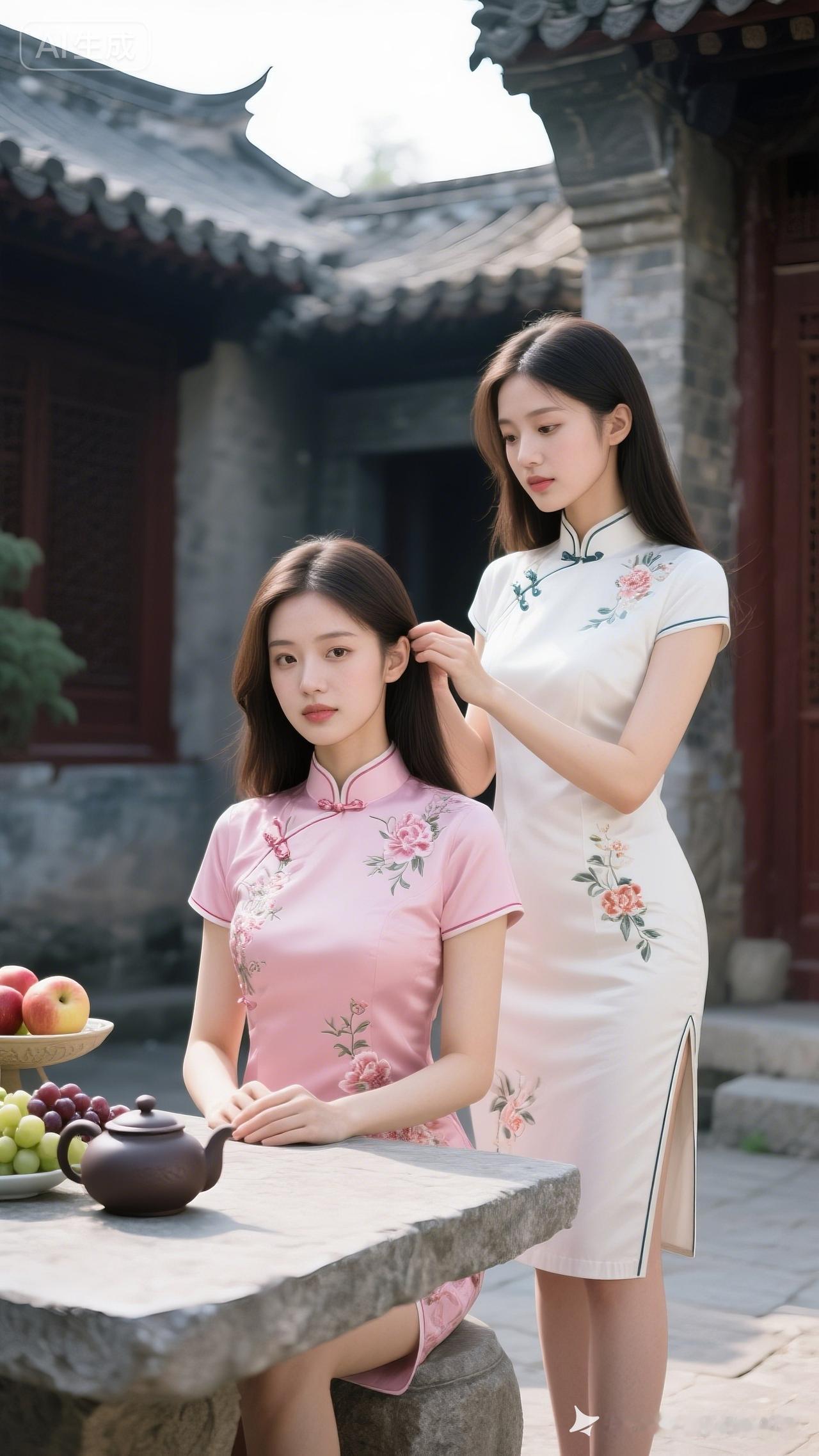 旗袍姐妹的古典时光,静谧的庭院中,品味生活的雅致。