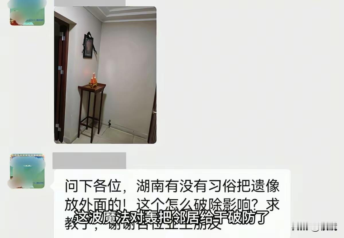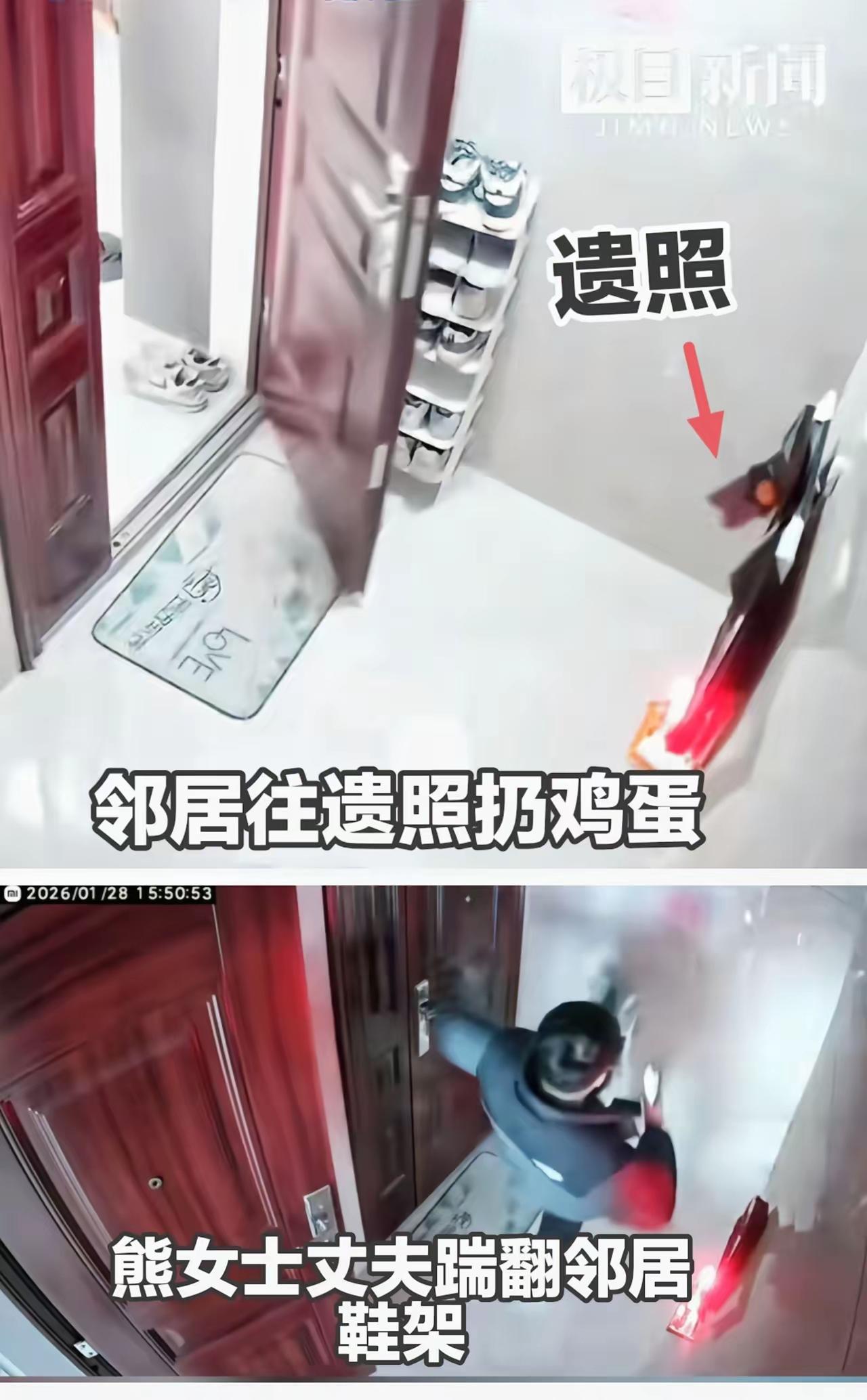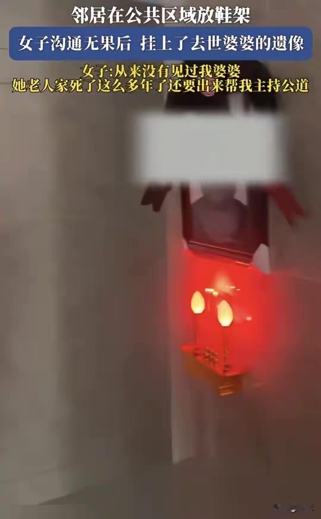最终还是婆婆承担了所有!湖南张家界某小区,两户人家闹得不可开交,最后报了警!警察来了一看,这家踢翻了对方的鞋柜,一地狼藉!那家将对方挂在楼道里的婆婆的遗照砸了鸡蛋,相框上满是蛋清蛋液! 闹到这一步,双方都不肯相让,尤其是在楼道里挂婆婆遗照的熊女士,更是满腹委屈! 她说她已经忍了好久了,自己本来在外地工作,回家较少。但每次拉着行李箱回来,都被对方鞋架子上的臭鞋子熏的恶心。自己拉着箱子进门,还得小心翼翼转身,即便这样,也撞倒了好几次对方的鞋架子,自己还得捏着鼻子给对方一双双的摆好! 后来实在受不了,就找了物业,物业调解多次,也没什么结果。于是自己就在楼道里挂上了婆婆的遗像,下面还摆上了贡品和蜡烛,正对着对方的鞋架 ,想要让他们知难而退! 没想到对方趁着夜晚,往婆婆的遗像上扔鸡蛋,搞得遗照上满是蛋清蛋液,一片狼藉!老公一看急了眼,一脚将对方的鞋架子踢翻 ,双方吵得不可开交,'最后惊动了帽子叔叔! 这件事最后顺利解决,鞋架子和遗像都撤了,但两家的关系,估计再怎么也修复不了了!都说远亲不如近邻,这俩邻居怕不是前世的仇人吧[捂脸][捂脸][捂脸]