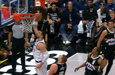 第二节比赛,祖巴茨面对无人防守扣篮不中,快船次节已落后掘金13分。