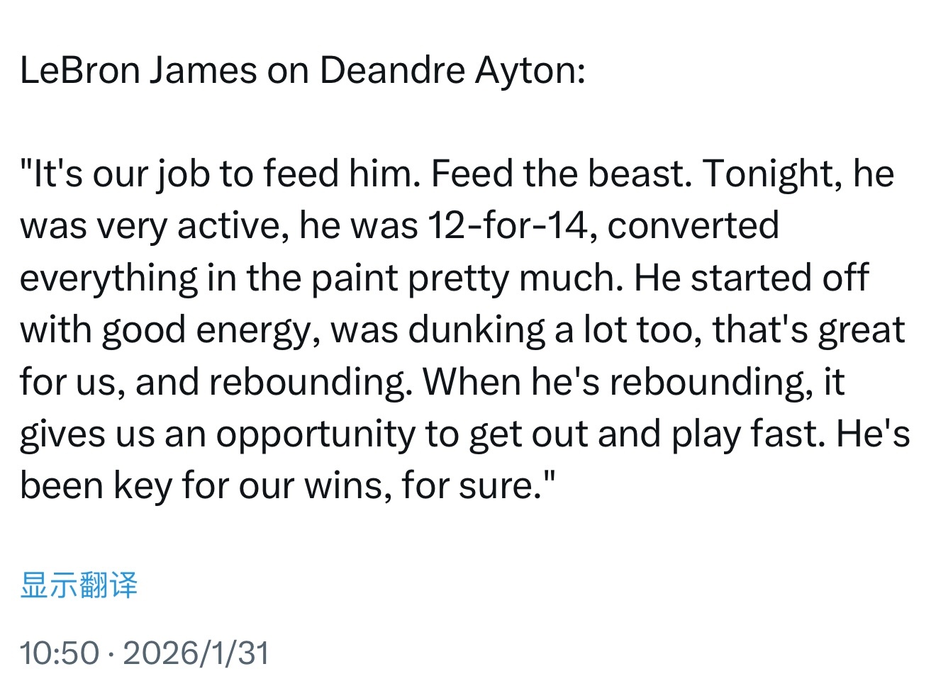 “我们的任务就是给他输送炮弹,满足这头猛兽的需求。今晚他非常活跃,14投12中,几乎在内线打进了所有该进的球。他从一开始就充满能量,多次完成暴扣,这对我们来说太棒了,还有他的篮板。当他抢下篮板时,就给了我们发动快攻的机会。毫无疑问,他是我们赢球的关键。”