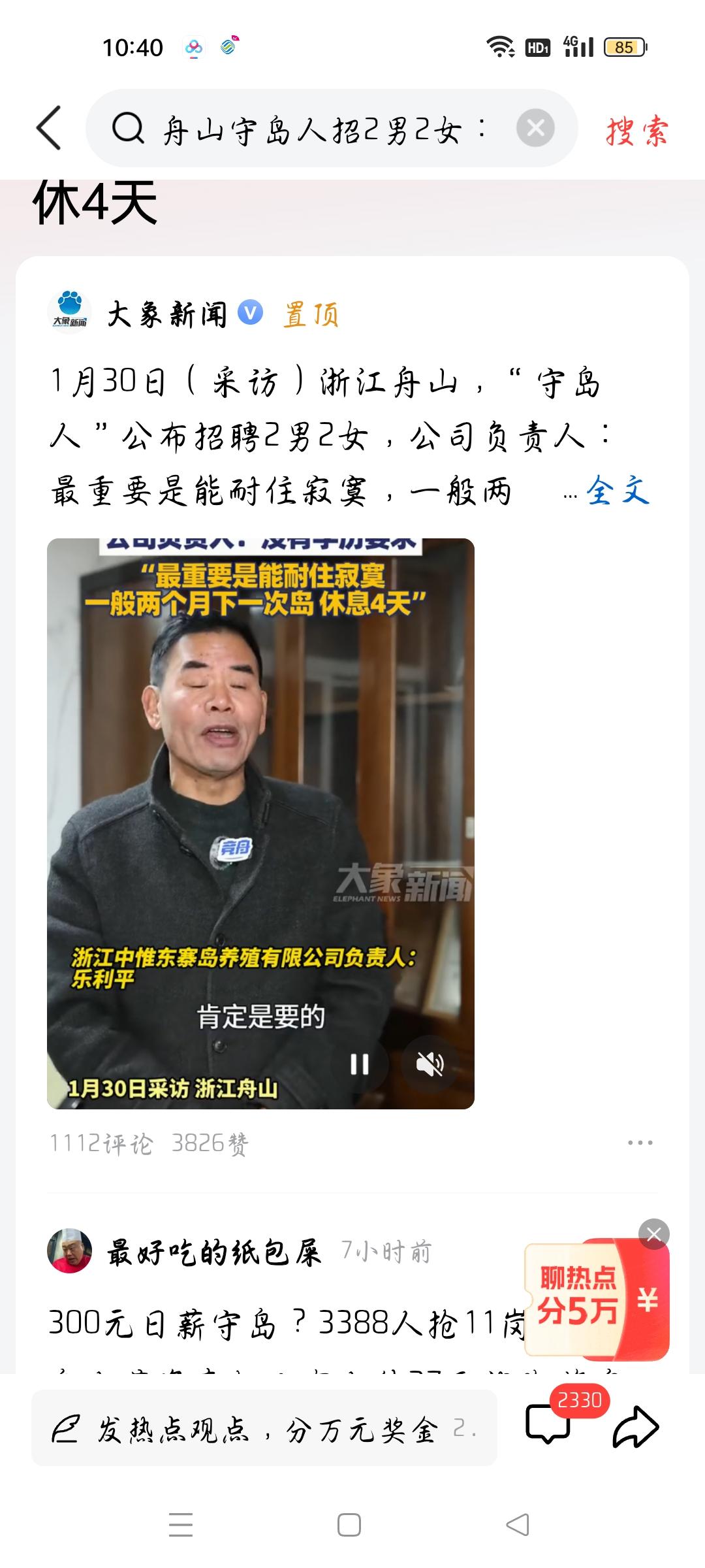 舟山守岛人招聘两男两女,我想说 据大象新闻报道,1月30日,浙江舟山守岛人招聘两男两女,公司负责人说,有项基本要求:要会游泳,还有耐得住寂寞,我想说,有人说守岛很轻松,很浪漫,这位负责人没有藏着掖着,你想一想两个月才能休息4天,等于一个月休养两天,既然是公司招聘,招聘你来干活,不是什么也不干。不是文人笔下的岛上浪漫,当你重复一件又一件的事情,你会感到枯燥无味。当然看在钱的份上,有人说一天也就300元。大家觉得会有很多人应聘吗?欢迎交流。