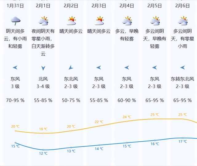 预计31日阴天,有小雨和轻雾,昼夜温差减小,气温15-20℃;31日夜间至2月1日受新一股冷空气影响,白天渐转多云,风力加大,气温下降;2月1日早晨最低气温将降至12℃左右,体感较冷,注意及时加衣保暖。2日-3日晴天间多云,早晚体感较冷,白天气温回升;4日-6日气温继续回升,云量增多,湿度加大。