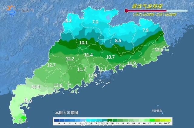 2月2日,广东全省大部晴到多云。最低气温:粤北、珠三角北部市县5~8℃,高海拔山区2~4℃,粤西市县13~17℃,其余市县8~12℃。