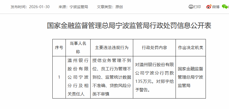 国家金融监督管理总局宁波监管局公告显示,温州银行宁波分行及相关责任人因存在授信业务管理不到位、员工行为管理不到位、监管统计数据不准确、贷款风险分类不审慎问题,对该分行给予罚款135万元,并对该行郑某给予警告。