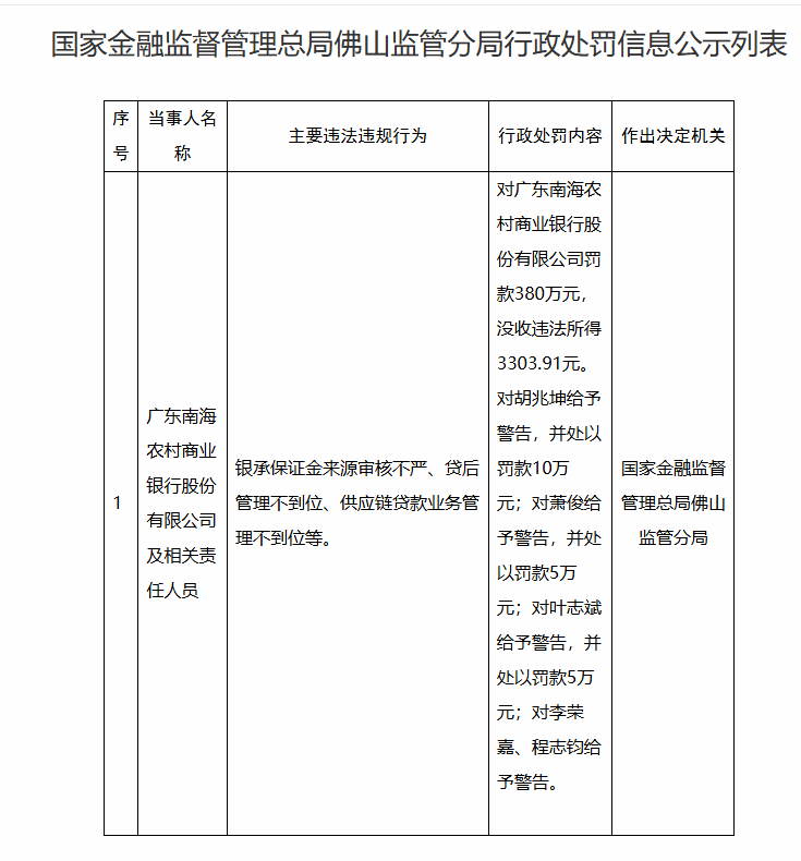 具体来看,国家金融监督管理总局佛山监管分局指出,广东南海农村商业银行存在的违法违规事实包括:银承保证金来源审核不严、贷后管理不到位、供应链贷款业务管理不到位等。