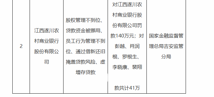 国家金融监督管理总局吉安监管分局公告表示,江西遂川农村商业银行存在的违法违规问题包括:股权管理不到位、贷款资金被挪用、员工行为管理不到位、通过借新还旧掩盖贷款风险、虚增存贷款。