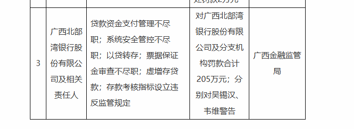 此外,国家金融监督管理总局广西监管局也公告称,广西北部湾银行存在的违法违规问题包括:贷款资金支付管理不尽职;系统安全管控不尽职;以贷转存;票据保证金审查不尽职;虚增存贷款;存款考核指标设立违反监管规定。同时,鉴于上述违法违规事实,对该行及分支机构合计罚款205万元,分别对吴某汉、韦某给予警告。