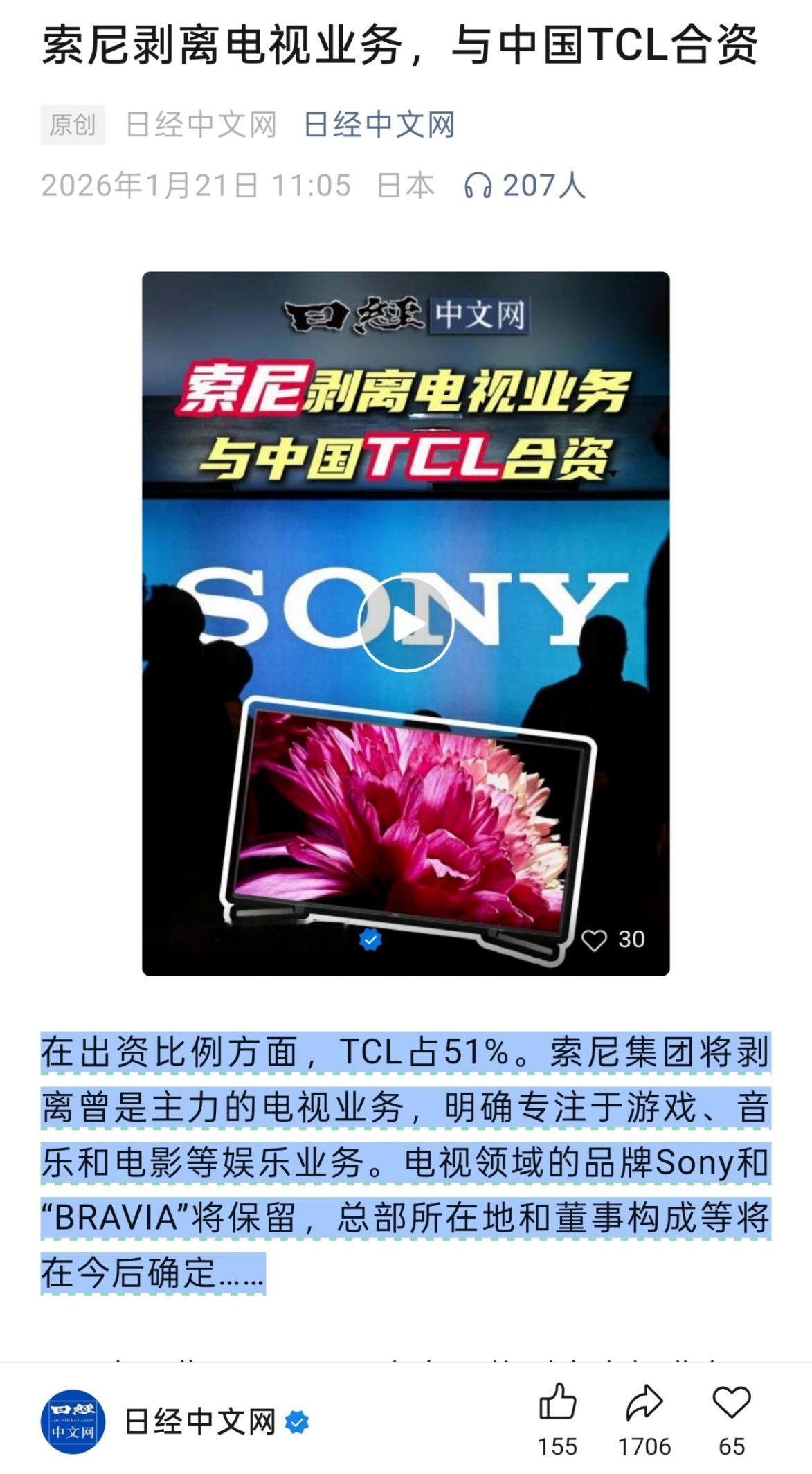 最近发生了两件大事,都与中国制造有关,风向彻底变了! 第一个,索尼电视一夜之间要姓“TCL”了。 第二个,中国车在欧洲卖疯了。 2026年1月20日,索尼和TCL正式签了合作备忘录,要联手成立一家合资公司,TCL持股51%、索尼持股49%,直白点说就是TCL要主导索尼家庭娱乐业务的全局。 从电视机、家庭音响的设计、生产,到销售、售后全链条,都由这家新公司包揽,产品还会继续用索尼的品牌,但背后操盘的核心力量已经换成了TCL。 这可不是简单的代工贴牌,放在十几年前,能给索尼做代工都算行业荣光,如今却是索尼主动找上门,让TCL来主导全链条运营。 索尼图的不是TCL的劳动力成本,毕竟现在中国早不是靠低价劳动力取胜的时代了。真正吸引索尼的,是TCL多年攒下的技术家底和产业链掌控力。 TCL旗下的华星光电,在面板领域的技术实力稳居全球前列,从材料研发到面板量产实现全自主可控,这让TCL在大屏、高端电视领域有了话语权。 加上全球布局的制造基地和成熟的供应链体系,能把从面板到整机的成本、效率做到最优。 索尼自己保留品牌和音视频技术优势,嫁接TCL的产业链能力,本质是强强联合,更是中国制造从“配角”变“主角”的直接体现。 不止电视行业,中国车在欧洲的表现更让人意外,甚至有点“搅局”的意思。 欧洲是汽车工业的老巢,当地人对大众、宝马、奔驰这些本土品牌的认可度极高,加上严苛的准入标准和环保法规,以前中国车想站稳脚跟,难度堪比登天,大多只能靠低价车型勉强刷点存在感。 但2025年的销量数据直接打破了固有印象,中国车企在欧洲全年卖出81.1万辆,比上一年翻了近一倍,市场份额冲到6.1%,几乎翻倍。 更亮眼的是12月单月销量,首次突破10万辆,市场份额逼近10%,增速远超欧洲车市平均水平。 上汽名爵、比亚迪、奇瑞这些品牌领跑,其中比亚迪插混车型还登顶了欧洲年度销量榜首,这可不是靠低价就能实现的。 欧洲市场不吃“低价牌”那一套,能突围靠的还是技术和产业链硬实力。 中国车企在新能源领域的技术积累早已成型,不管是纯电还是插混技术,都能满足欧洲严苛的环保标准。 更关键的是,中国拥有全球最完整的新能源汽车产业链,从电池、电机到智能座舱部件,90%以上核心部件能实现国内闭环生产。 宁德时代、远景动力等电池企业还纷纷在欧洲建厂,既规避了贸易壁垒,又能快速响应本地需求,这种“技术+本地化布局”的组合拳,让欧洲车企都不得不正视。 以前是中国车企跟着欧洲标准走,现在中国的产业链能力反而在影响欧洲汽车产业的格局,这种角色转换,正是竞争力升级的最好证明。 其实这两件事根本不是孤立的,背后藏着中国制造核心竞争力的赛道切换。 早年间,中国制造的标签是“低成本代工”,靠充足的劳动力承接全球订单,别人设计好、定好标准,我们只负责生产组装,赚点辛苦钱,主动权完全在别人手里。 现在早就不是那个时代了,劳动力成本优势逐渐弱化,但我们靠多年的技术沉淀和产业链整合,走出了一条新路子。 TCL能主导索尼的业务,是因为掌握了核心显示技术和全链条运营能力;中国车能征服欧洲市场,是因为新能源技术和产业链协同能力形成了壁垒。 这种竞争力,不是靠低价,而是靠“别人没有、我们擅长”的硬实力,从被动跟随别人的标准,变成了主动制定规则、主导合作。 往后看,中国制造的亮点只会越来越多。不再是靠量取胜,而是靠技术和产业链掌控力站稳全球市场,这种转变,才是真正的风向大变。 那些曾经的行业巨头主动向中国企业抛橄榄枝,那些最难攻克的市场被中国产品打开,都在说明一个道理:中国制造的底气,早就换了内核。 对于此事,大家有什么看法呢?欢迎在评论区留言讨论!