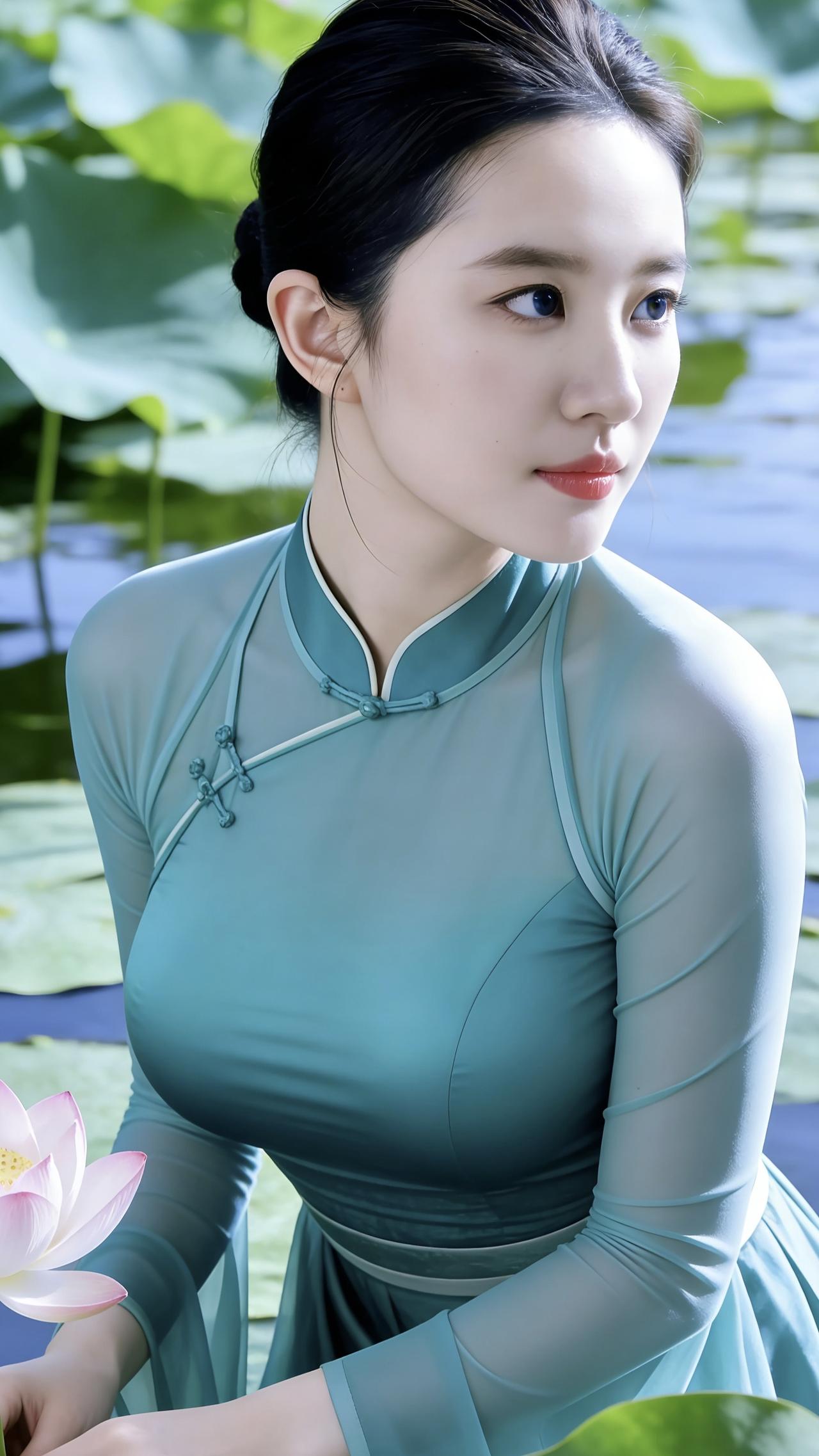 我蹲在荷塘边的石阶上,指尖轻触粉白的荷花瓣,带着水汽的清香漫在鼻尖。身上的改良旗袍是母亲新裁的,浅绿的纱料像刚抽芽的荷叶,领口的白缎滚边嵌着黑玉盘扣,针脚细密得像叶脉的纹路。 乌发在脑后挽成圆髻,只鬓边漏出几缕碎发,被荷风卷着蹭过耳尖,有点痒。垂眸时,我看见衣料的薄纱在水光里泛着细闪,唇瓣沾了一点午后的暖,比荷尖的露珠更软。 远处的荷叶铺成一片绿云,蝉鸣混着蛙声漫在风里。母亲说,旗袍的颜色要衬着景致才好,就像荷要开在水里。此刻我望着塘中的倒影,衣料的凉贴着臂弯,忽然觉得这一身带着荷香的旗袍,连同脚下的塘水,都是江南女子把日子浸在清润里的模样。 荷间忆 荷间泛舟 荷间少女韵 荷间仙韵 荷间治愈感 荷间花瓣逸 荷间古风照