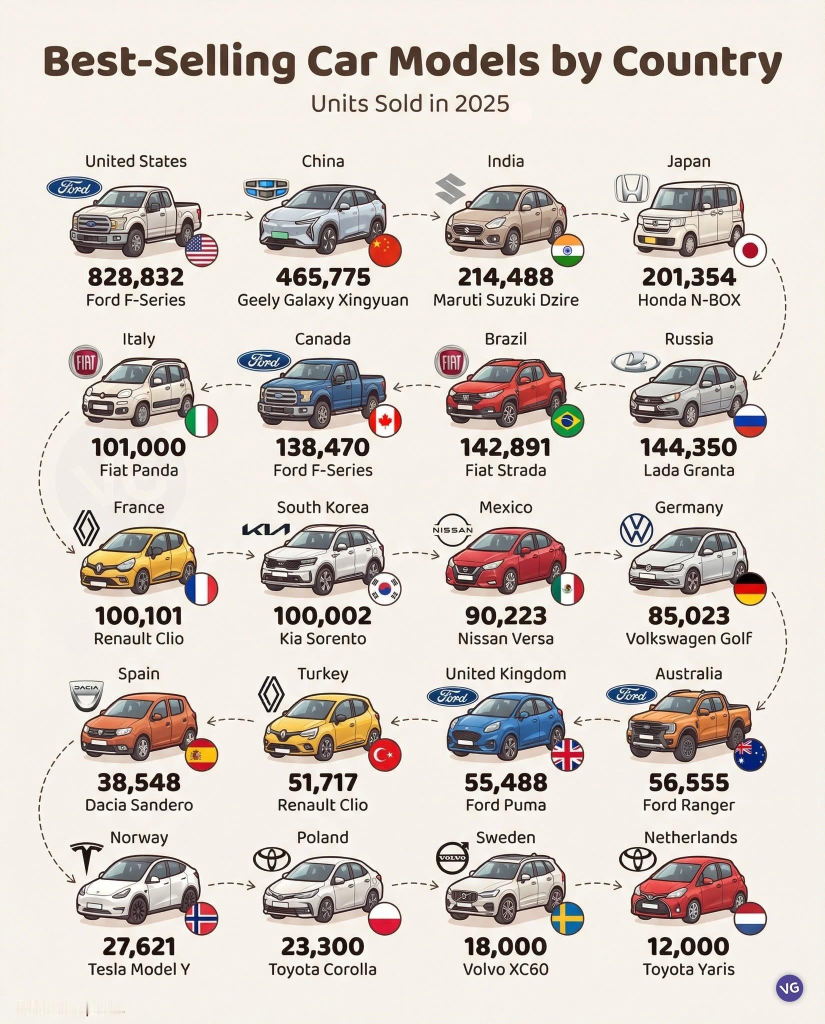 吉利银河吉利心愿 国外媒体统计在2025年,20个国家销量最高的车中国是「吉利星愿」其他国家有没有让你们惊讶的车
