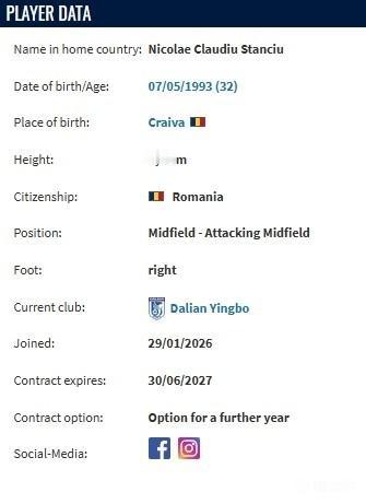 大连英博本赛季能进前四了! 德转更新,罗马尼亚国家队队长、武汉三镇旧将斯坦丘自由