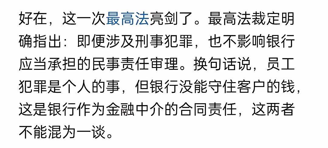 最高法这波操作太提气了!直接给银行的“甩锅套路”画上句号,以后储户血汗钱存银行被员工转走,再也不用吃“败诉哑巴亏”了! 谁没听过这样的糟心事?储户在银行柜台正经存钱,冲着的就是银行的信誉和保障,结果被不法员工欺上瞒下转走钱款。 银行倒好,一出事就把责任全推给离职员工,说什么“个人行为与银行无关”,让储户自己找罪犯要钱,可赃款早就被挥霍一空,储户只能血本无归。 以前好多类似案件,储户起诉银行经常败诉,就像呼伦贝尔那11名储户,220多万存款被柜台员工挪用,一审居然被驳回诉求,理由还是“员工个人犯罪”。 这些储户在银行营业场所、通过正规柜台办理业务,员工身着工装、用银行设备操作,怎么到最后就成了“个人行为”?这逻辑简直离谱到没边! 现在好了,最高法在“大连银行1.8亿元理财资金失踪案”的再审裁定里,把话说得明明白白:工作人员执行工作任务时犯罪,不影响银行承担民事责任。 这起案件里,储户一审二审都败诉,硬生生熬了十多年,终于靠着最高法的明确裁定讨回公道,这不仅是个案的胜利,更是给所有储户吃了颗定心丸。 我的观点很明确:银行不能既享受“金字招牌”带来的信任红利,又在出问题时甩锅脱身。储户信任的是银行,不是某个员工,监管漏洞是银行的责任,凭啥让储户买单? 以前银行总拿“员工越权”当挡箭牌,却忘了自己在人员管理、业务审核上的失职。要是银行监管到位,员工怎么可能有机会挪用巨额存款? 金融行业的信任根基,从来不是靠嘴说出来的,而是靠实打实的责任担当。最高法的裁定,本质上是在倒逼银行守住底线,把储户资金安全放在第一位。 对比那些让储户维权无门的旧案例,这次裁定太关键了——它明确了“职务行为”的核心:只要员工在工作时间、工作场所,以银行名义办事,银行就必须担责。 这不是在偏袒储户,而是在维护最基本的公平。银行作为专业金融机构,本该比储户更懂风险防控,不能把管理失职的代价,转嫁给普通老百姓。 现在越来越多类似案件被关注,从大连1.8亿案到呼伦贝尔220万案,都在提醒我们:储户的血汗钱不能成为银行监管漏洞的“牺牲品”。 最高法的出手,终结的不只是银行的甩锅好日子,更是在重塑金融行业的信任。以后银行再想靠“甩锅员工”逃避责任,可没那么容易了。 你身边有没有人遇到过存款“不翼而飞”的情况?你觉得银行该如何从根源上杜绝这类问题?欢迎在评论区聊聊你的看法~ 麻烦看官老爷们右上角点个“关注”,后续更多民生权益解读和法律热点分析,第一时间就能看到,感谢大家支持!