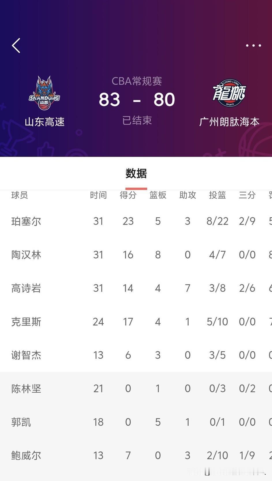 高速83:80险胜广州!但胜利与邱彪无关! 不是黑邱彪,而是他的用人让人诟病。孙桐林、于德豪直流除了犯规其他也是一无是处。结果场场比赛雷打不动的占用比赛时间,不是任人唯亲是什么?前三节外线20投2中的可笑命中率竟然都不给上场投进记三分球的小将王证一分钟时间!而鲍威尔9中1的浪投却有13分钟的登场时间! 还是那句话,无论邱彪带队成绩如何,只要不给年轻球员机会就是在挖山东篮球的根基!这就是为什么把新疆带进总决赛却下课的主要原因! 本场比赛的胜利陶汉林、高诗岩当记头功。珀塞尔如果不是第三节的出色发挥本场比赛也是不合格的。克里斯发挥只是中规中矩而以!