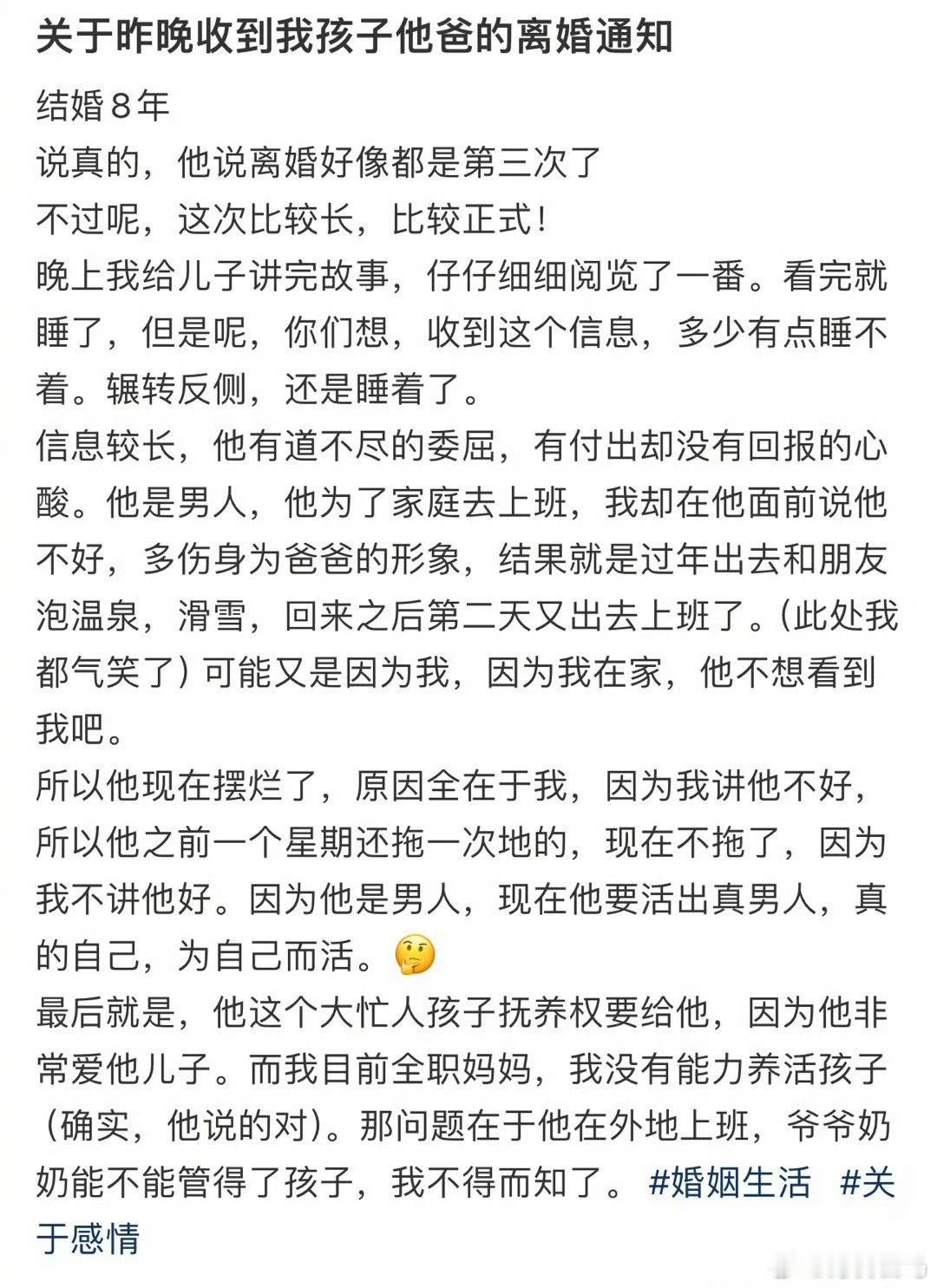 关于昨晚收到我孩子他爸的离婚通知姐姐离婚后住回娘家了
