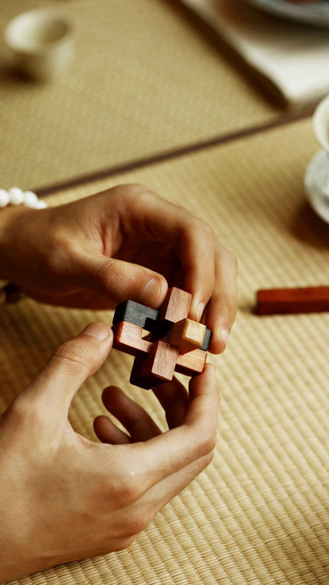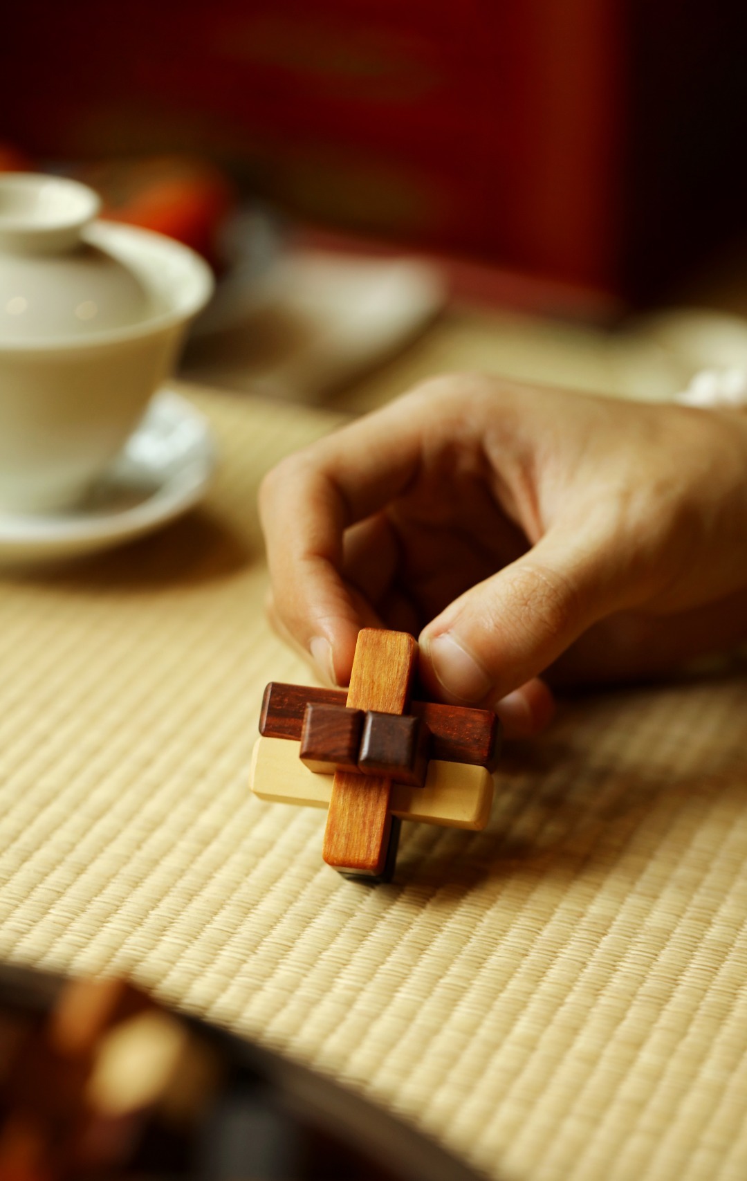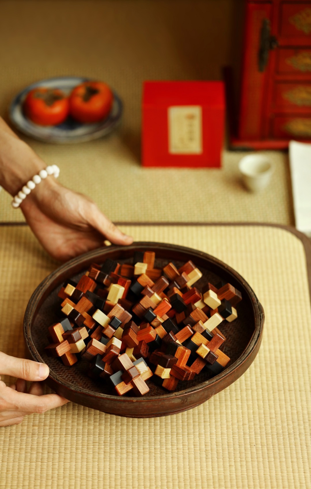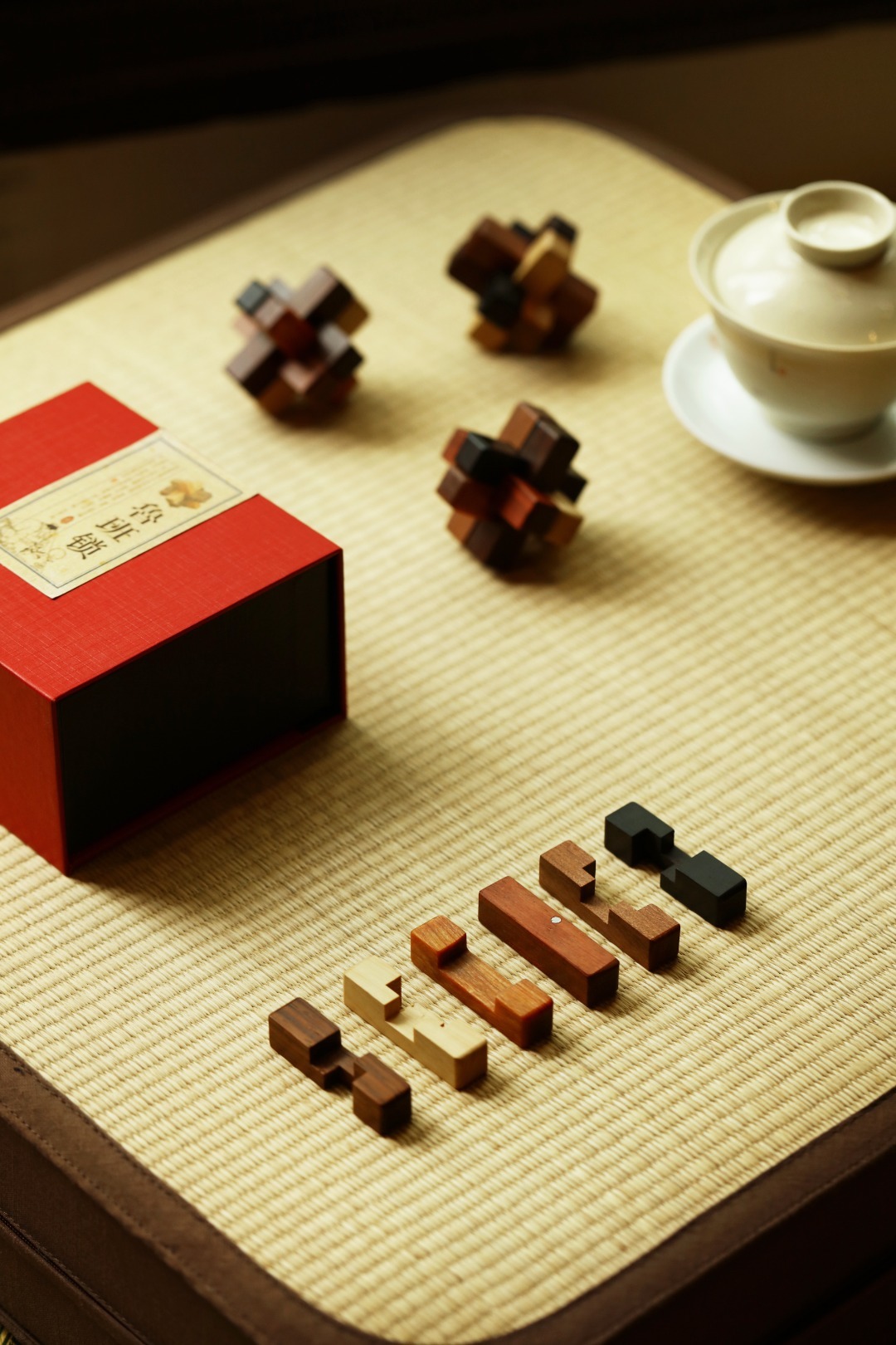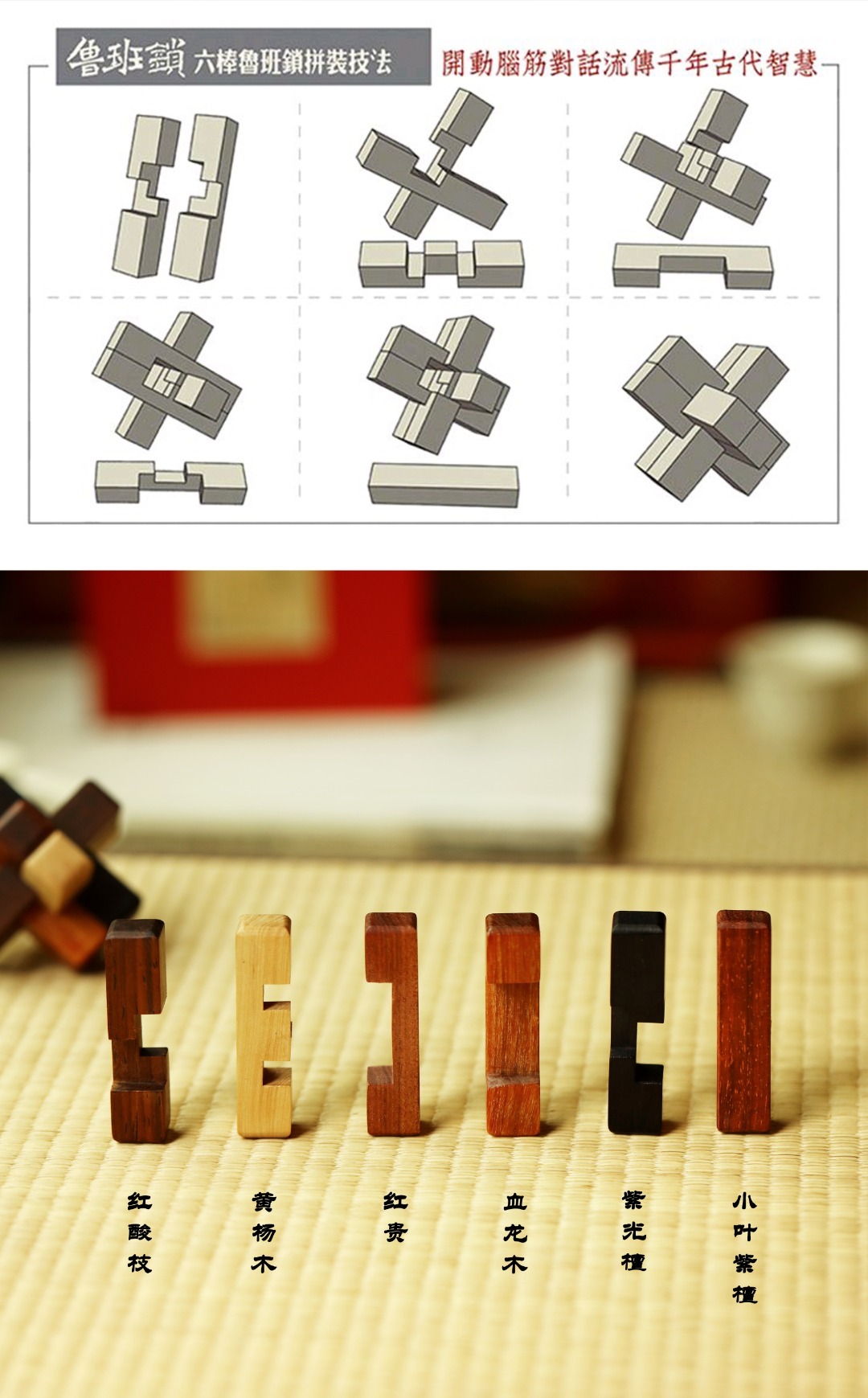 六种红木制成,凝聚古人智慧,易拆难装。可观赏把玩,亦可放松益智。