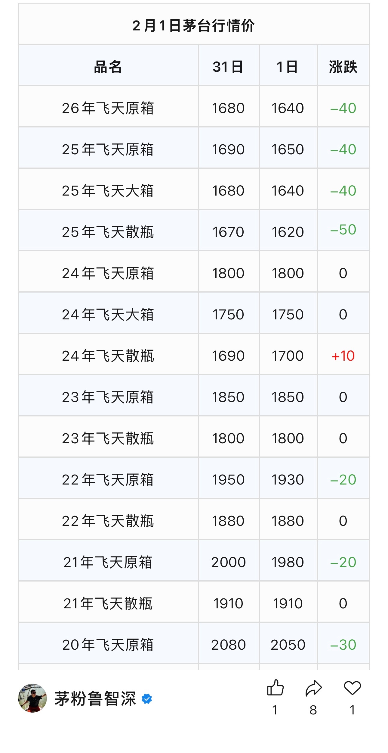 茅台酒连续两天下跌,两天加起来,跌了110元一瓶,最新飞天茅台酒行情价1640元